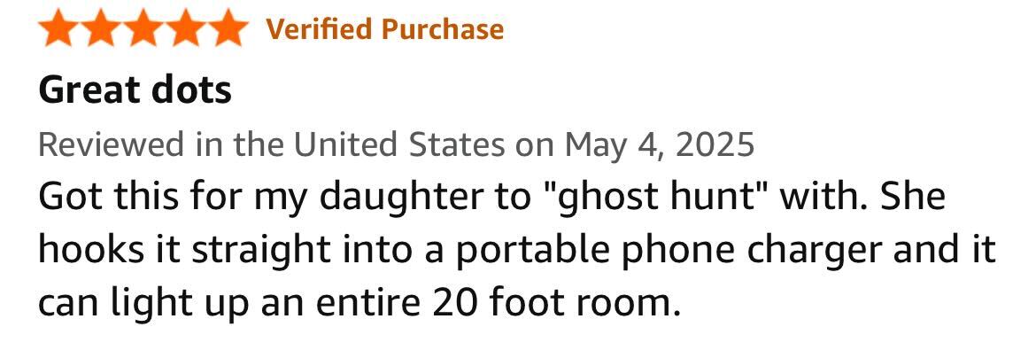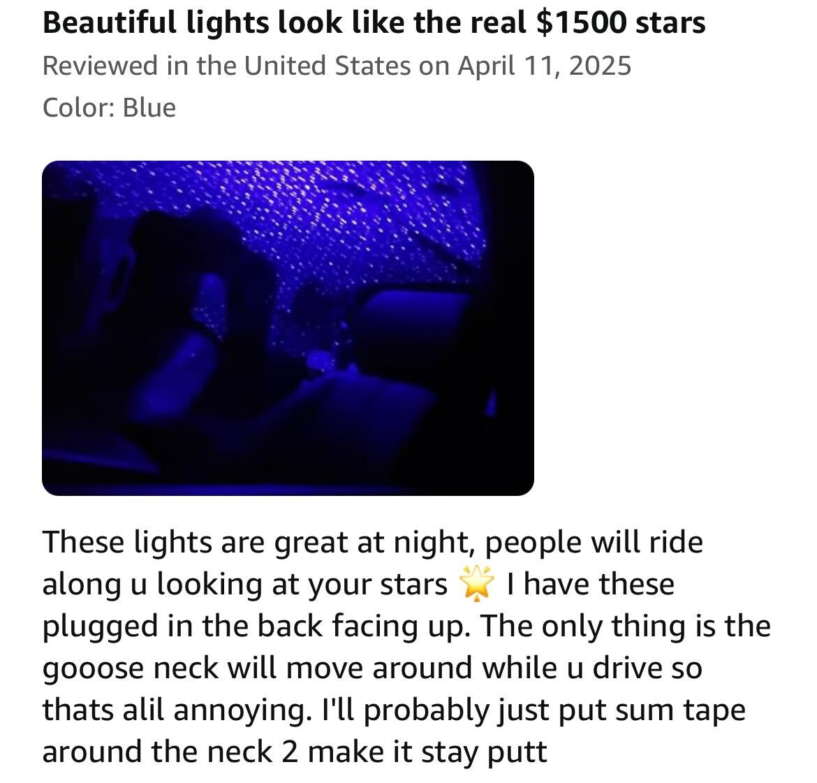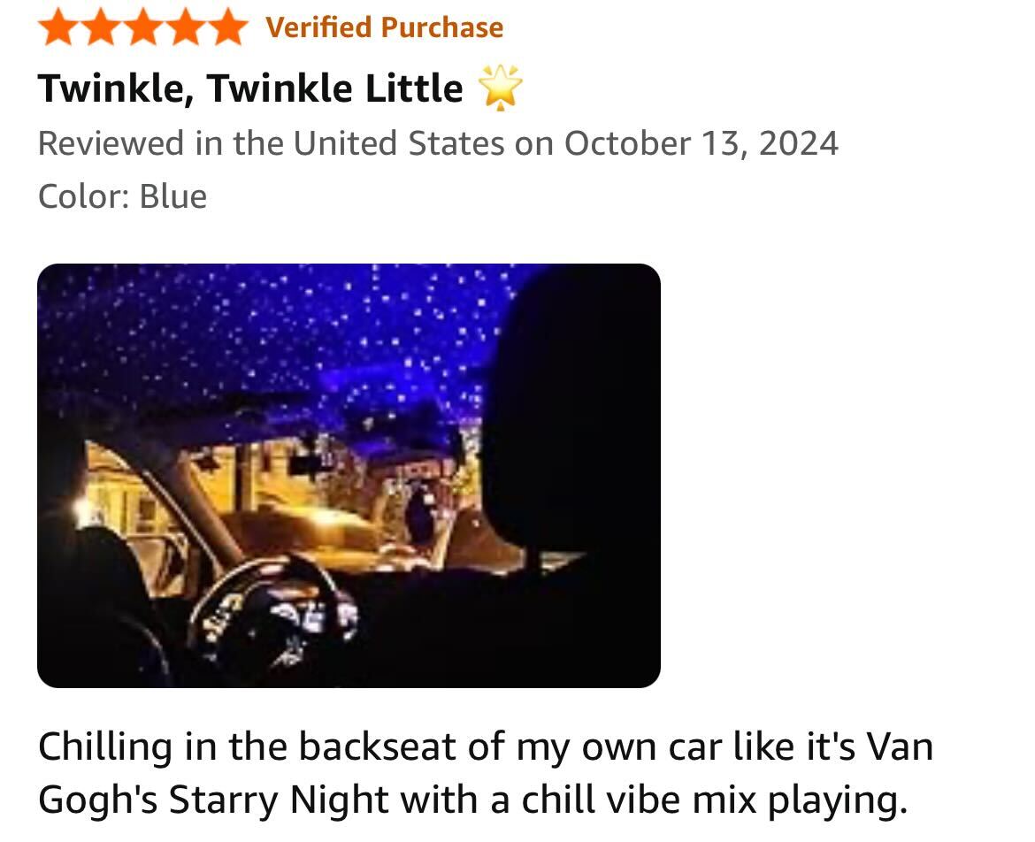 Okay, now we’re getting somewhere! I mean, come on: “people will ride along u looking at your stars.” (And, sidetone: this isn’t the only review mentioning how it can be used in a car. Which just makes me think how far we’ve come. Like, when I was a kid, I would be accused of attempted murder by my parents for turning on the overhead dome light to find something I dropped on the floor. Now we can drive around with laser projectors? Wow!)