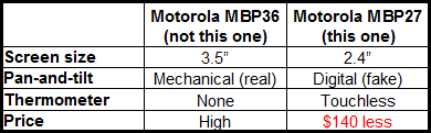 - 2.4" color LCD is almost the best- Digital pan-and-tilt is OK but not as good as mechanical pan-and-tilt- Parent unit includes touchless thermometer for measuring temperature of baby, bottle, or baby’s first hot glue gun: the one feature this has that the best baby monitor doesn’t! YES!- Model: MBP27T