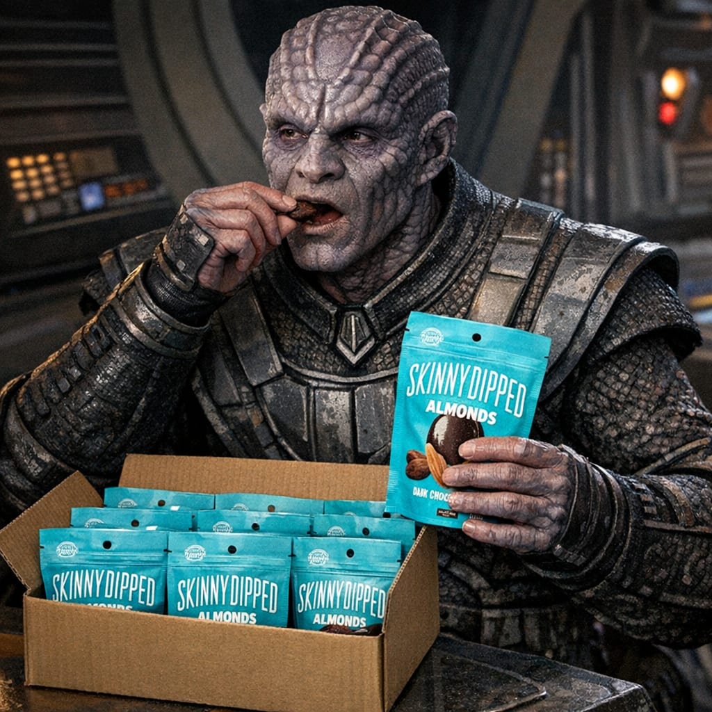 @cfg83 Here’s the image you requested for “Jem Hadar warrior from Star Trek Deep Space Nine is eating out of a bag of SkinnyDipped Almonds a…”