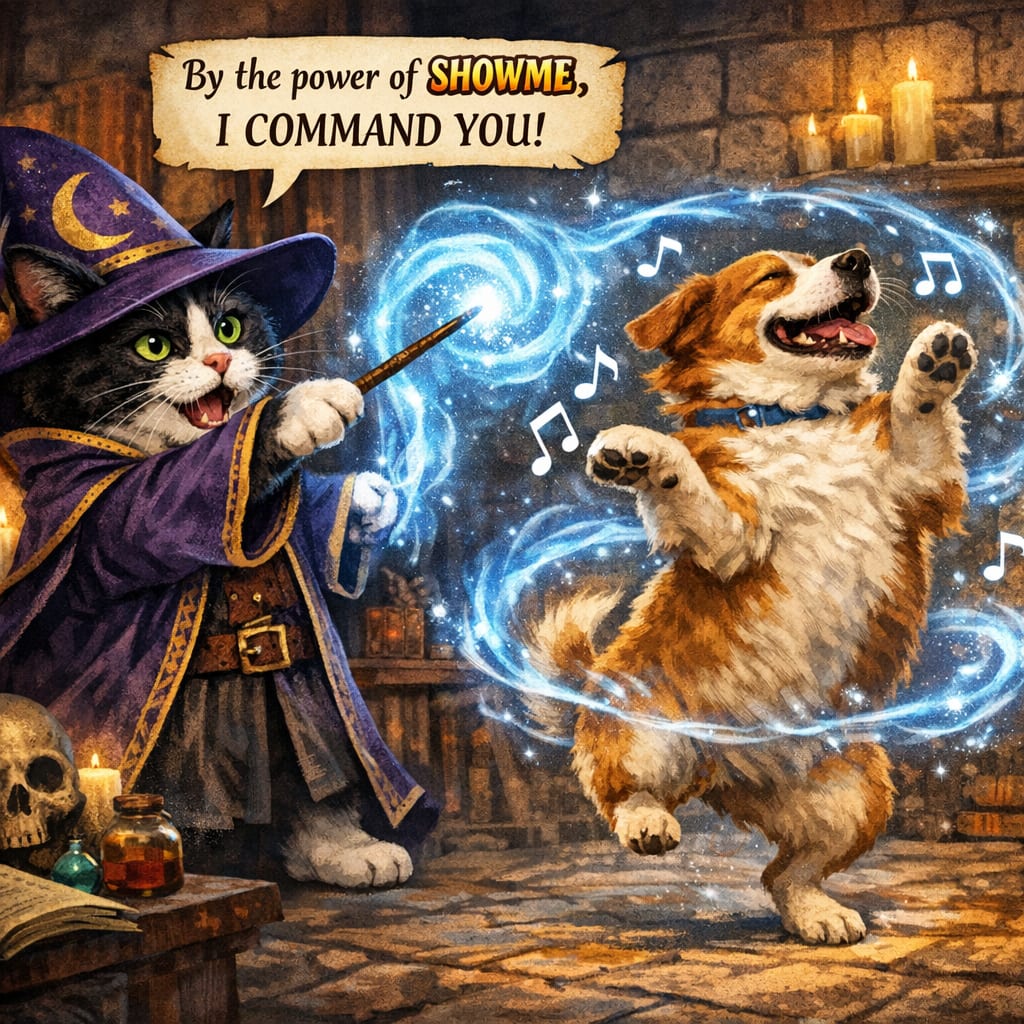 /showme Cat in wizard costume casting spell to make dog dance while saying “By the power of showme, I command you!”.