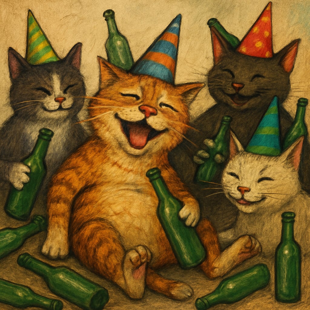 /showme a very drunken cat & his friends, wearing party hats, with the bottle all around