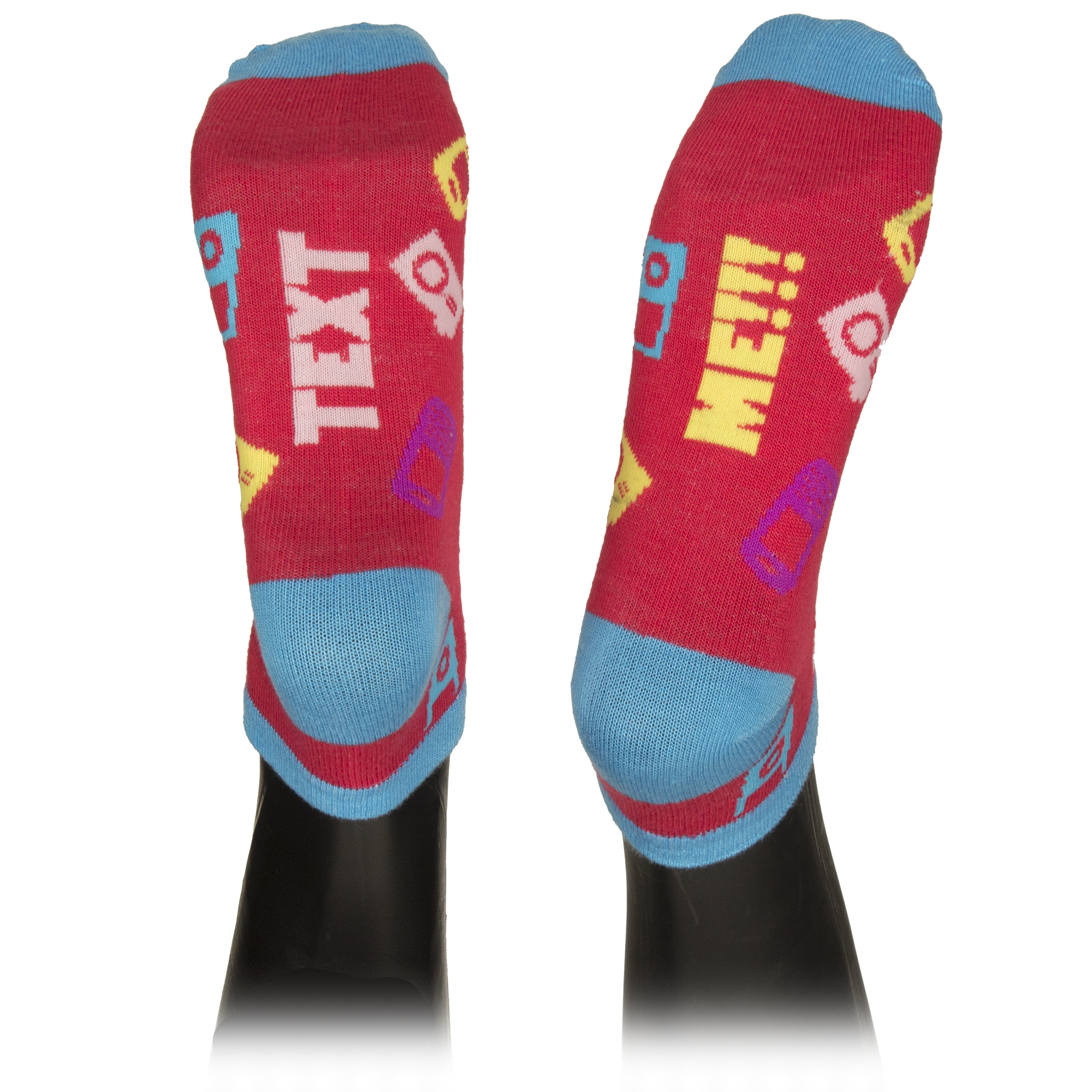 “TEXT ME!!!” scream socks covered in cameras and iPods.