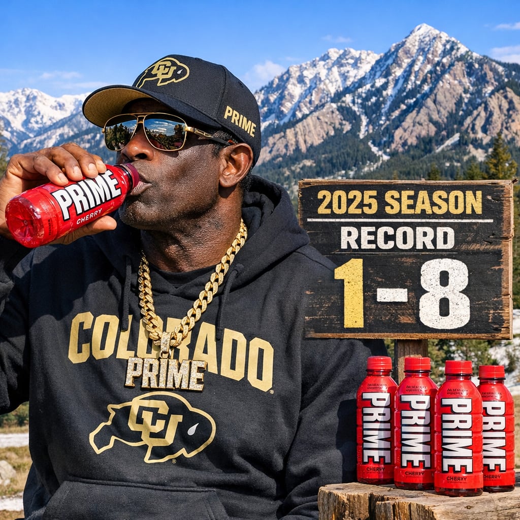 /show me prime time Deion Sanders drinking Prime cherry electrolyte drinks in a Colorado Mountain setting with their 1 win to 8 loss 2025 football record prominently displayed
