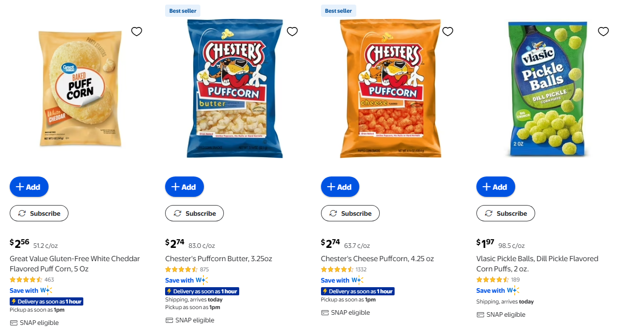 We’re priced at $0.33 per oz. For other puffs at Walmart, you have $0.51/oz for Great Value, $0.84/oz for Chester’s, and $0.99/oz for Vlasic