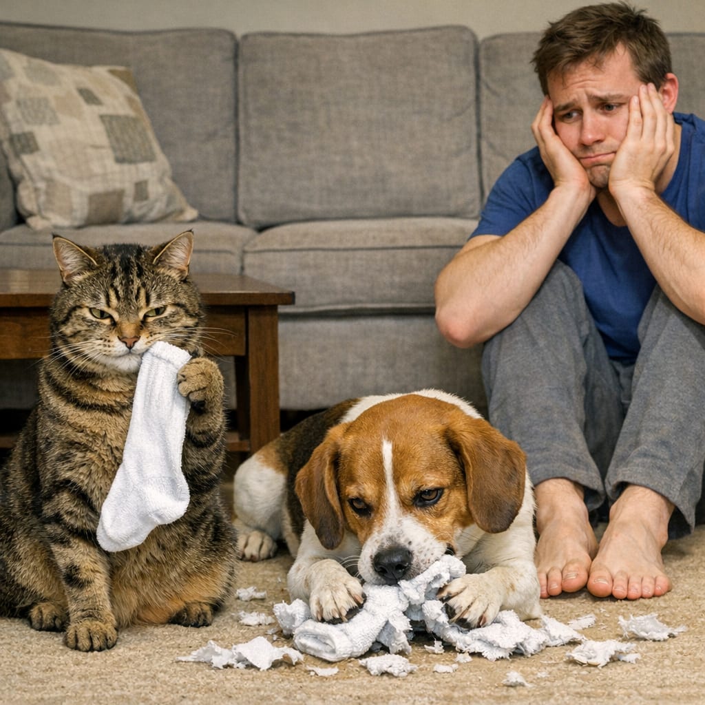 /showme sly cat holding one white sock and dog chewing up one white sock and sad barefoot human looking on.