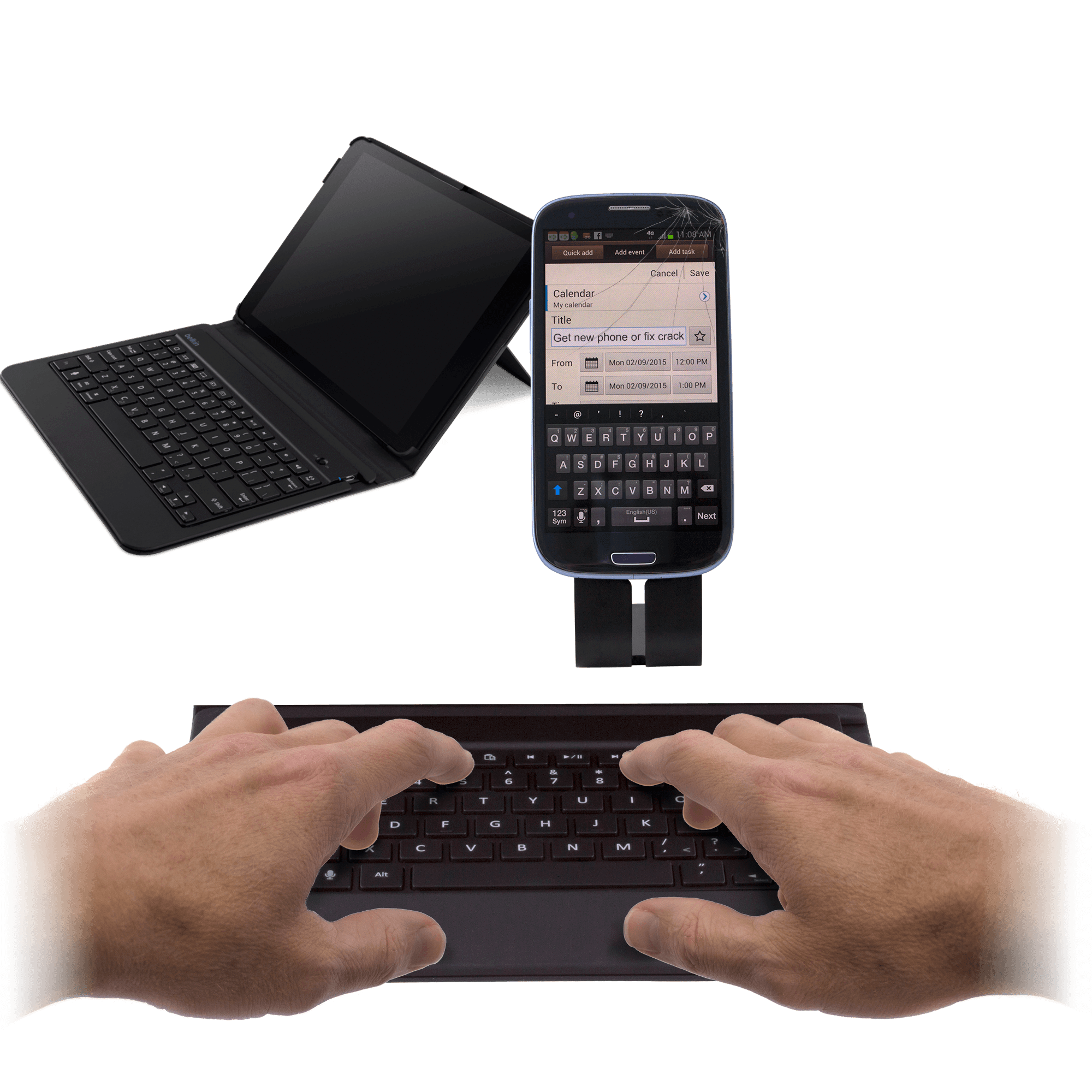 Specs ====- Model: F5L159ttC00 - Dimensions: 0.75 x 8.5 x 11.5 in - QODE Slim Style Keyboard Case for Samsung Galaxy Tab 3 10.1’’ - Bluetooth keyboard works with most smartphones and tablets - Function keys work with Android, but also work with iOS - Adjustable stand for comfortable typing angles - Keyboard folds flat and out of the way for handheld use - Large, Well-Spaced Keys reduce typing errors - Slim and Lightweight Condition: New Warranty: 1 Year Belkin Estimated Delivery: 2/20 - 2/24Shipping: $5 or free with VMP What’s in the Box? ====2x Belkin Bluetooth Keyboard Case 2x USB charging cable 2x Product Guide Pictures====Cut the casesBoth casesTwo keyboardsThe case closedOpenedRetail boxesType type type…Price Check ==== $47.98 (For 2) at Amazon