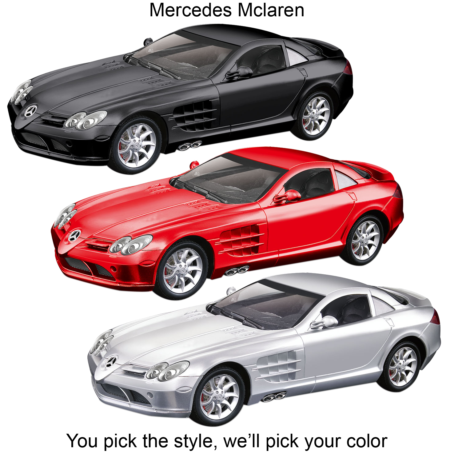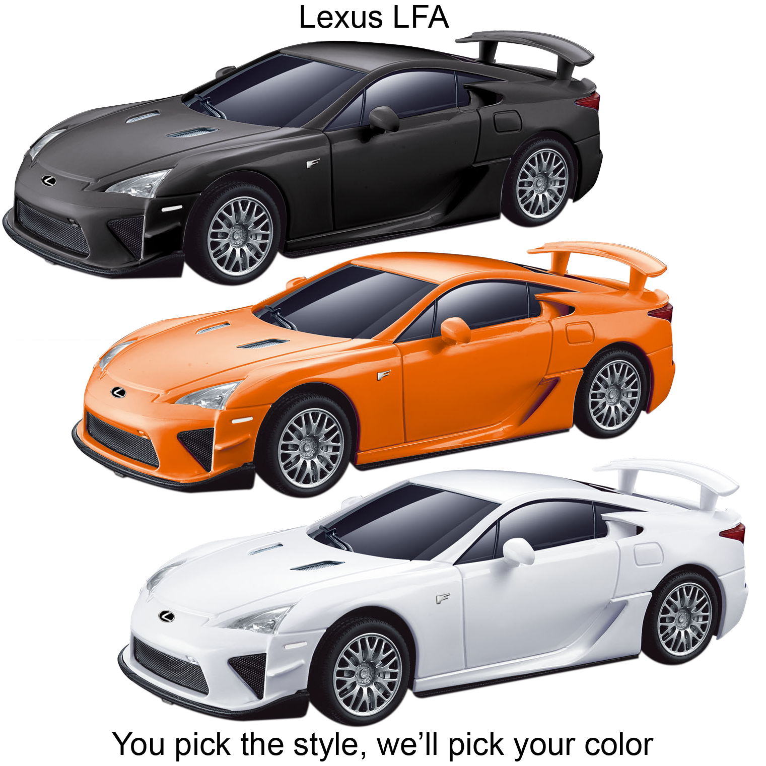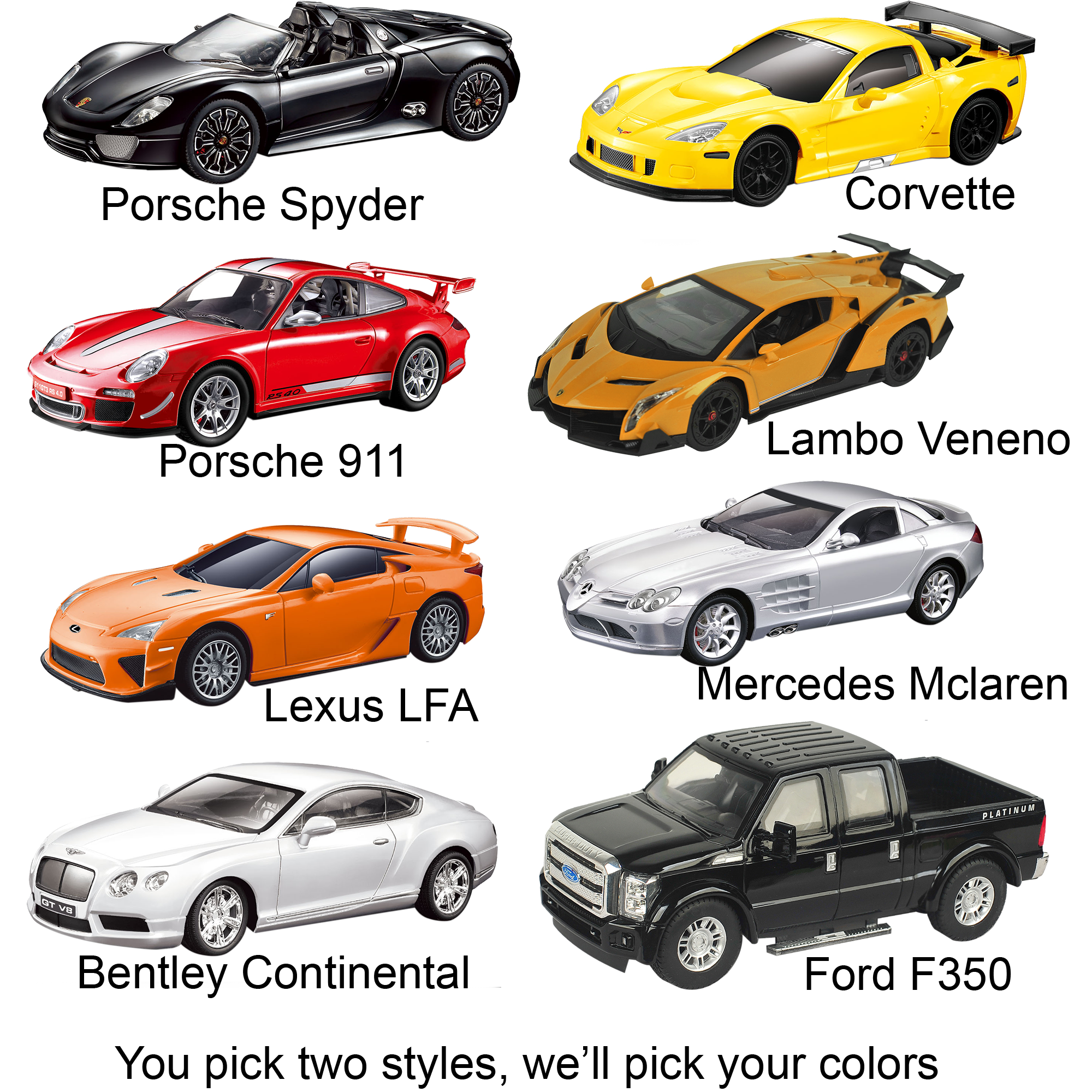 Specs ====- Model: 866-2419, 866-2427, 866-2423, 866-2425, 866-2414, 866-2428, 866-2804, 866-2417- Condition: New- Power: 2x AA (controller), 3x AA (car)- 1:24 scale- Headlights, tailights (some models)- Forward, Backward, Left, Right- Comes in two channels, but they are random so you might have the joy of racing two cars together, or the joy of controlling two cars with one remote. Hedge your bets and buy as many as possible What’s in the Box? ====2x RC cars2x ControllerPictures====CARS!SPYDER!F350!911!VENENO!BENTLEY!MCLAREN!LEXUS!CORVETTE!INCLUDED STUFF!REMOTE!BATTERY COVERS WITH SCREWS ARE HELL!HAUL YOUR SODA!BOX!VROOOOM VROOM CRASH!Price Comparison ====$59.98 (for 2) at Amazon