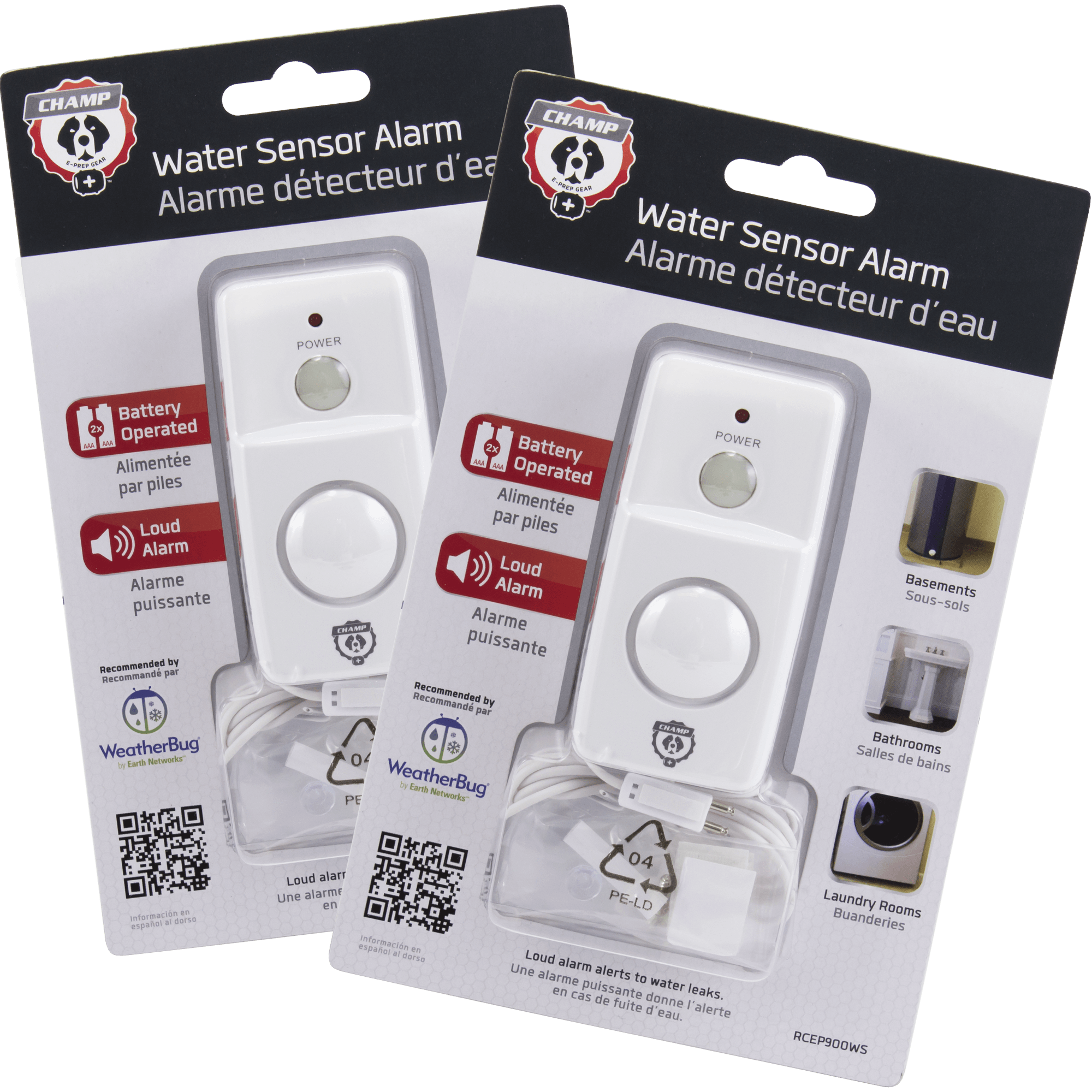 Specs ====- Model: RCEP900WS- Alarm: 90dB for 20 seconds, with one minute break, and then an additional 20 seconds- Low battery alert- Mount with included suction cup or included screw- 38" cable allows for water sensor to be set in hard-to-reach places- Requires 2x AAA batteries- User manualCondition: NewWarranty: 1 Year VoxxEstimated Delivery: 9/16 - 9/18Shipping: $5 or free with **VMP**What’s in the Box?====2x Champ water sensor4x velcro cable holder2x Mounting screw2x Suction cupPictures ====Retail packagingNo frogs hereSize comparisonEverything includedPrice Comparison====$29.98 List, $23.98 (for 2) at AmazonFind a relevant price comparison? Please share it in a comment in this thread