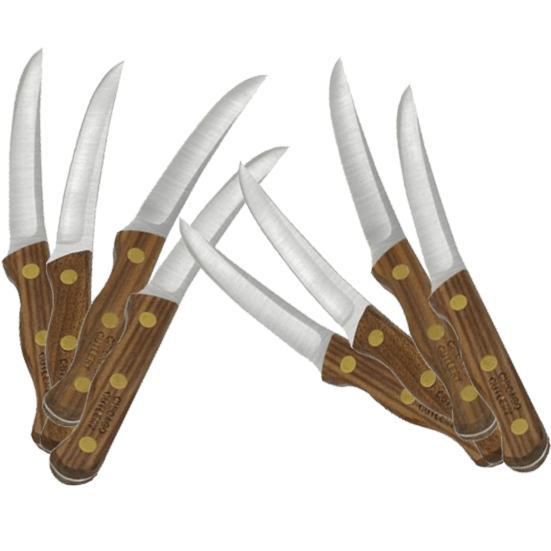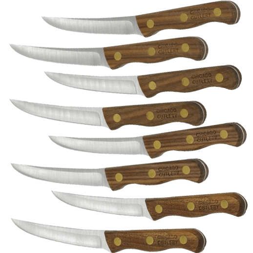 Specs ====- Model: 1104670- Blade length: 4in- High-carbon stainless steel blades- “Taper Grind” edges for optimum sharpness, edge retention and easier resharpening- Full-tang blade with three brass rivets for added strength- Solid walnut handlesCondition: New Warranty: Lifetime Chicago CutleryEstimated Delivery: 4/1 - 4/3Shipping: $5 or free with VMP What’s in the Box? ====8x Chicago Cutlery steak knivesPictures ====KnivesKniiiivesStick stuff on 'em or whateverPrice Check ====$79.90 List, $33.95 (For 2) at Amazon