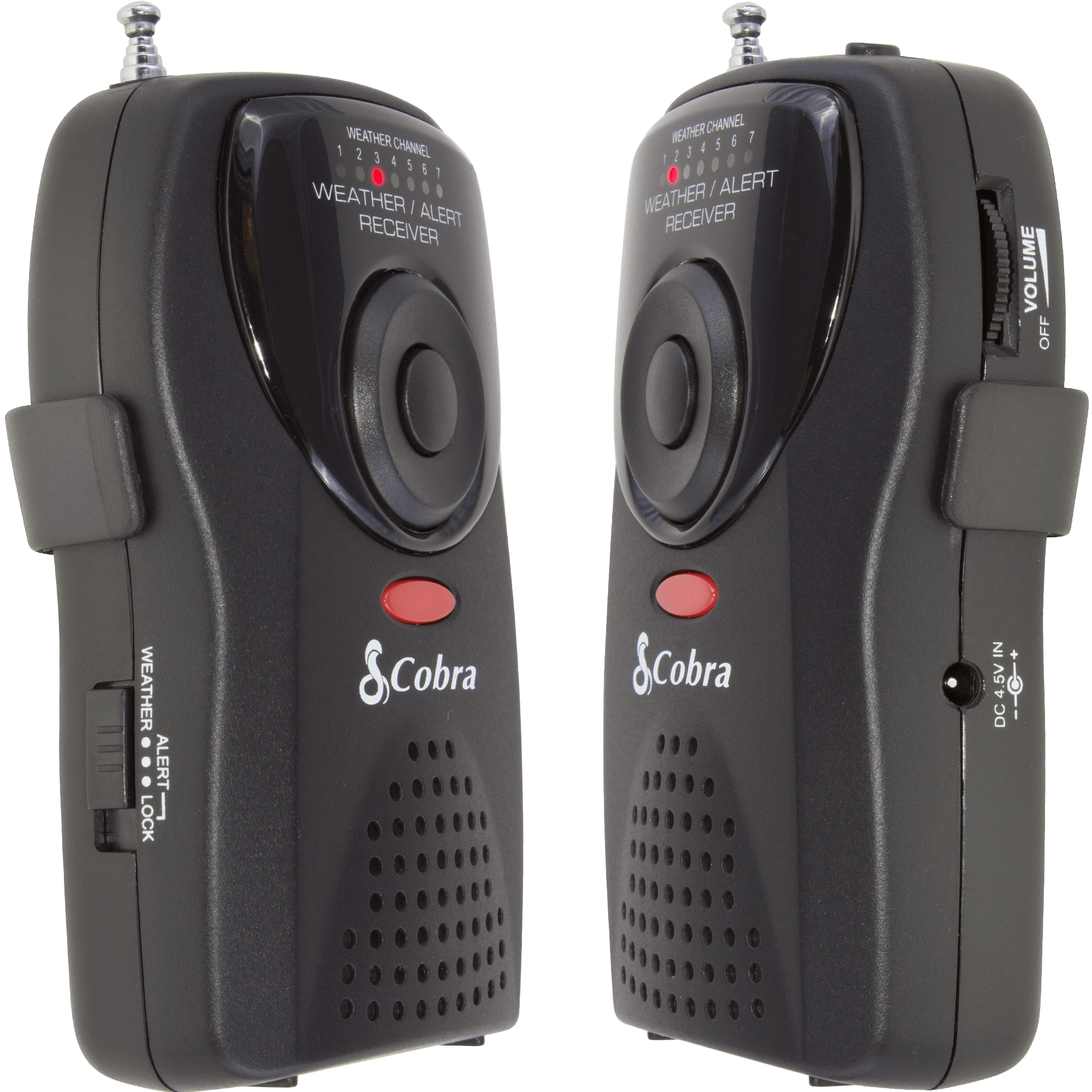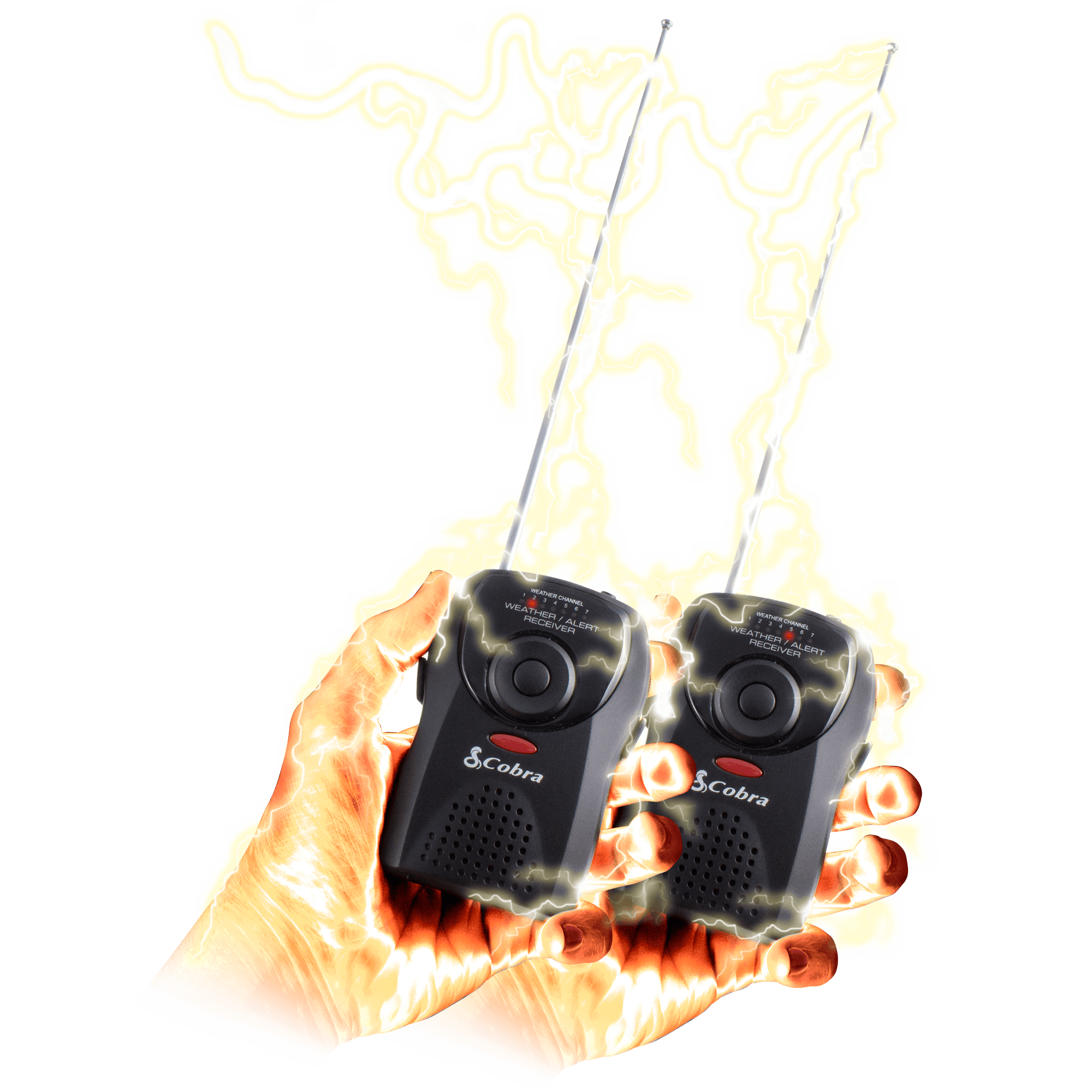 Specs====- Model: CWR-100- Takes 2 AAA batteries (Included)- Dimensions: 6.5 x 3.2 x 2 in- 7 channels- Public Alert Certified- Up to 40 mile rangeCondition: NewWarranty: 1 Year CobraEstimated Delivery: 12/26-12/29Shipping: $5 or free with VMP What’s in the Box?====2x Weather radios4x AAA batteriesPictures====Face of the radioTwo radiosSide viewBrrrzzzzttttInset photo from MattysFlicks used under Creative Commons LicensePrice Check====$35.94 (For 2) at Amazon$37.90 (For 2) at Walmart