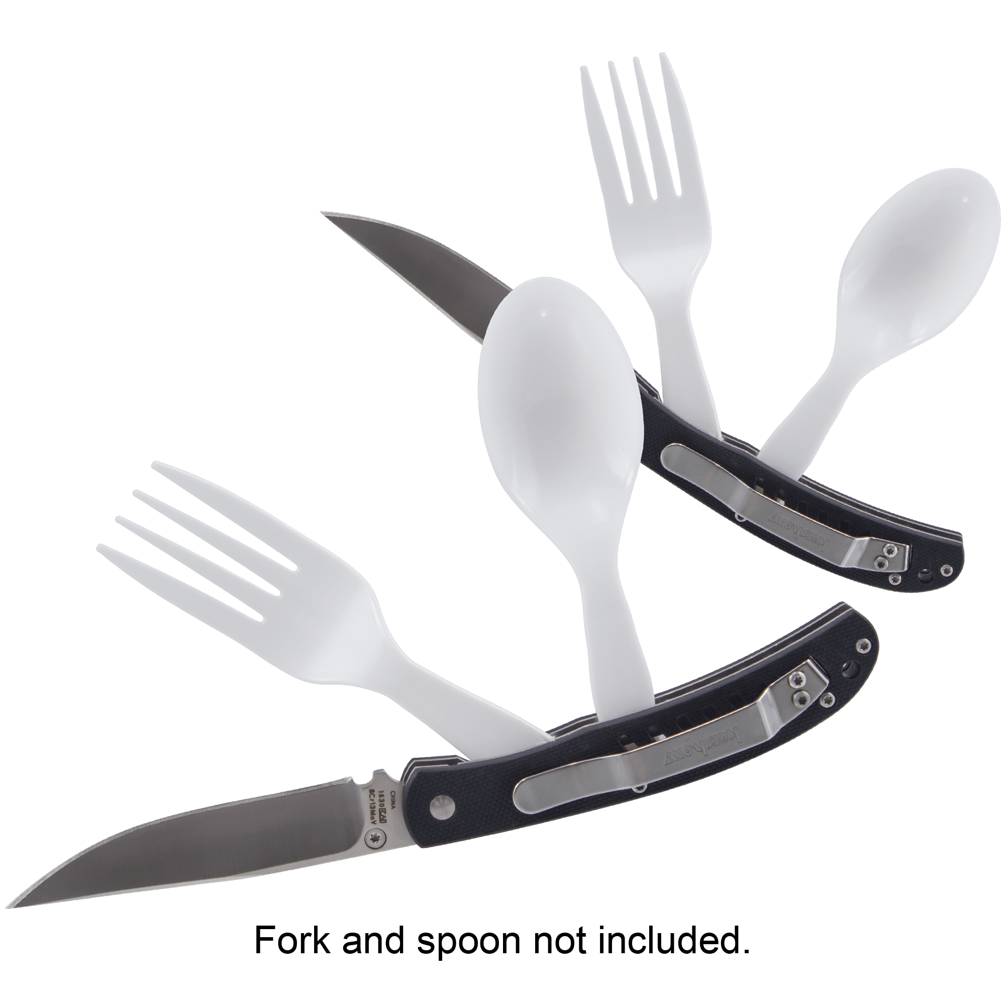 @sligett you don't need a fork and spoon! You use one knife in each hand! If there's some serious need for other utensils, carve them with your knife!