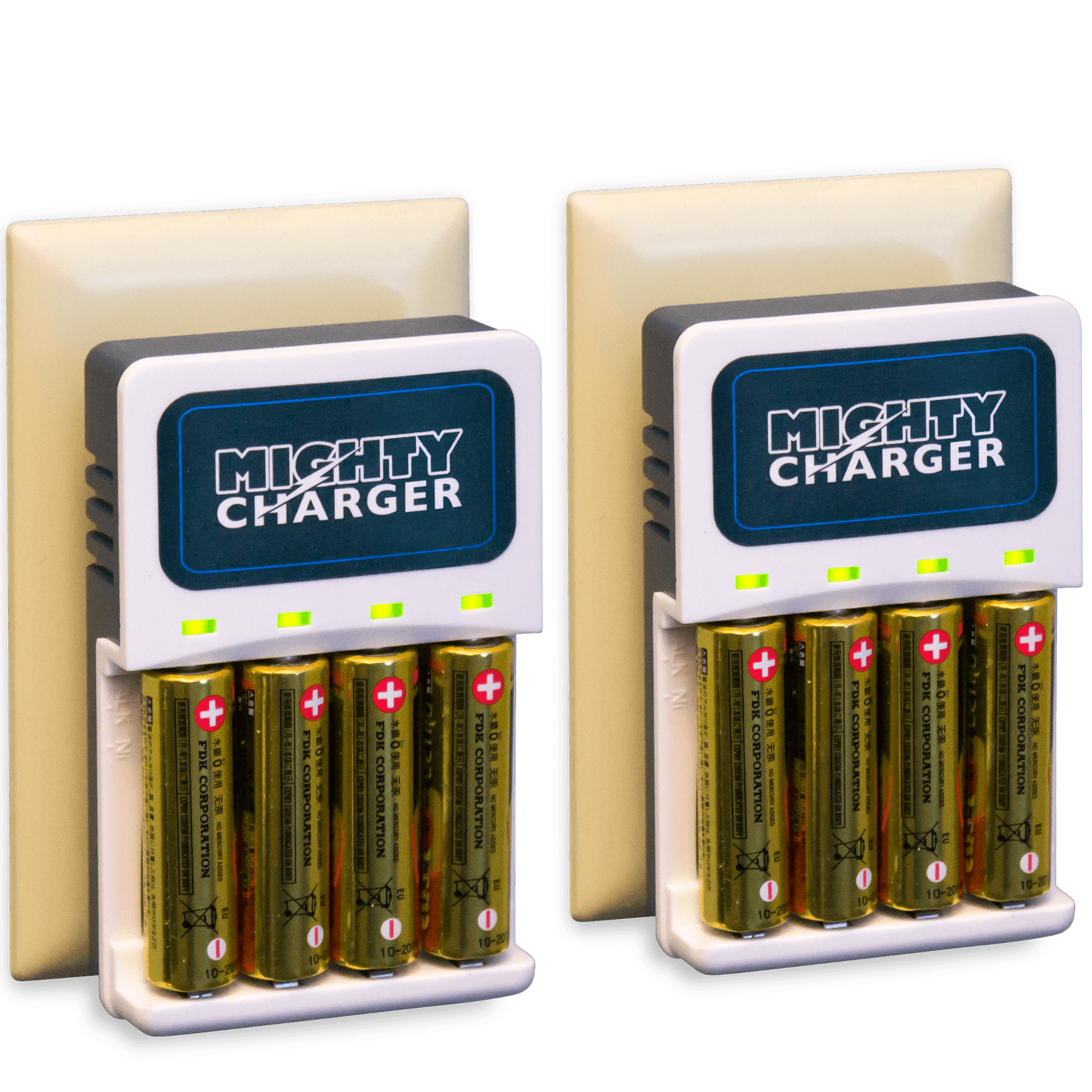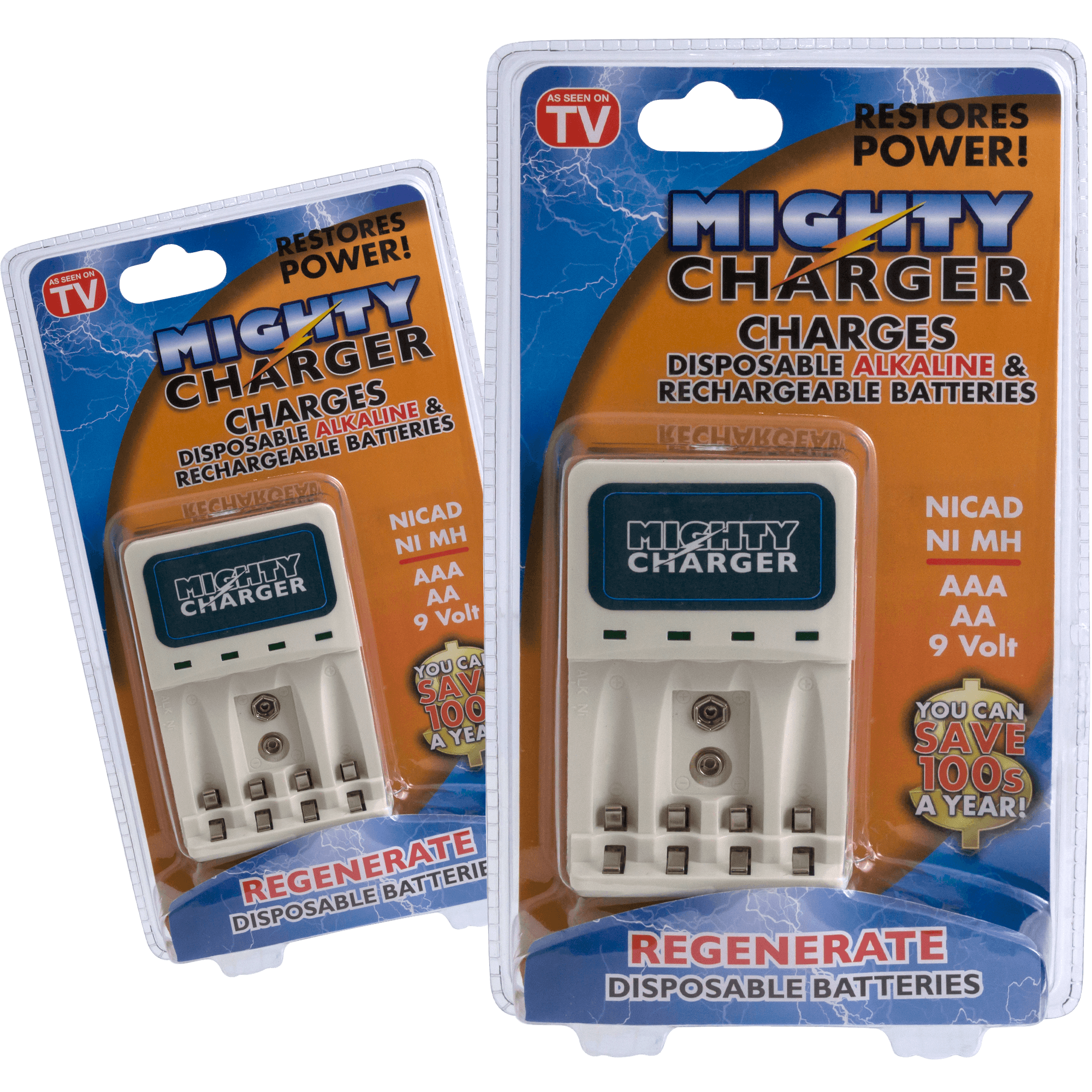 Specs ====- Model: MC109- Input: 100-240V ~50/60Hz .2A- Output: 5Vdc 800mA 4x(AA or AAA batteries) | 12Vdc 300mA 1x(9v battery)- Charges Alkaline/NiCad/Ni-MH batteries- AAA NiCad Battery: Capacity - 400mAh | Charge Time - 4 hours- AA NiCad Battery: Capacity - 800mAh | Charge Time - 8 hours- AAA Ni-MH Battery: Capacity - 700 mAh | Charge Time - 6 hours- AA Ni-MH Battery: Capacity - 1300 mAh | Charge Time - 10 hours- AAA Alkaline Battery: Capacity - 1.5 V | Charge Time - 2 hours- AA Alkaline Battery: Capacity - 1.5 V | Charge Time - 3 hours- 9 Volt Battery: Charge Time - 6 hours- User ManualCondition: NewWarranty:90 Day Harvest DirectEstimated Delivery: 6/18 - 6/22Shipping: $5 or free with **VMP**What’s in the Box?====2x Mighty Charger2x User ManualPictures ====Retail boxesChargers chargingChargers not chargingSide viewPrice Comparison====$34.34 (For 2) at AmazonFind a relevant price comparison? Please share it in a comment in this thread