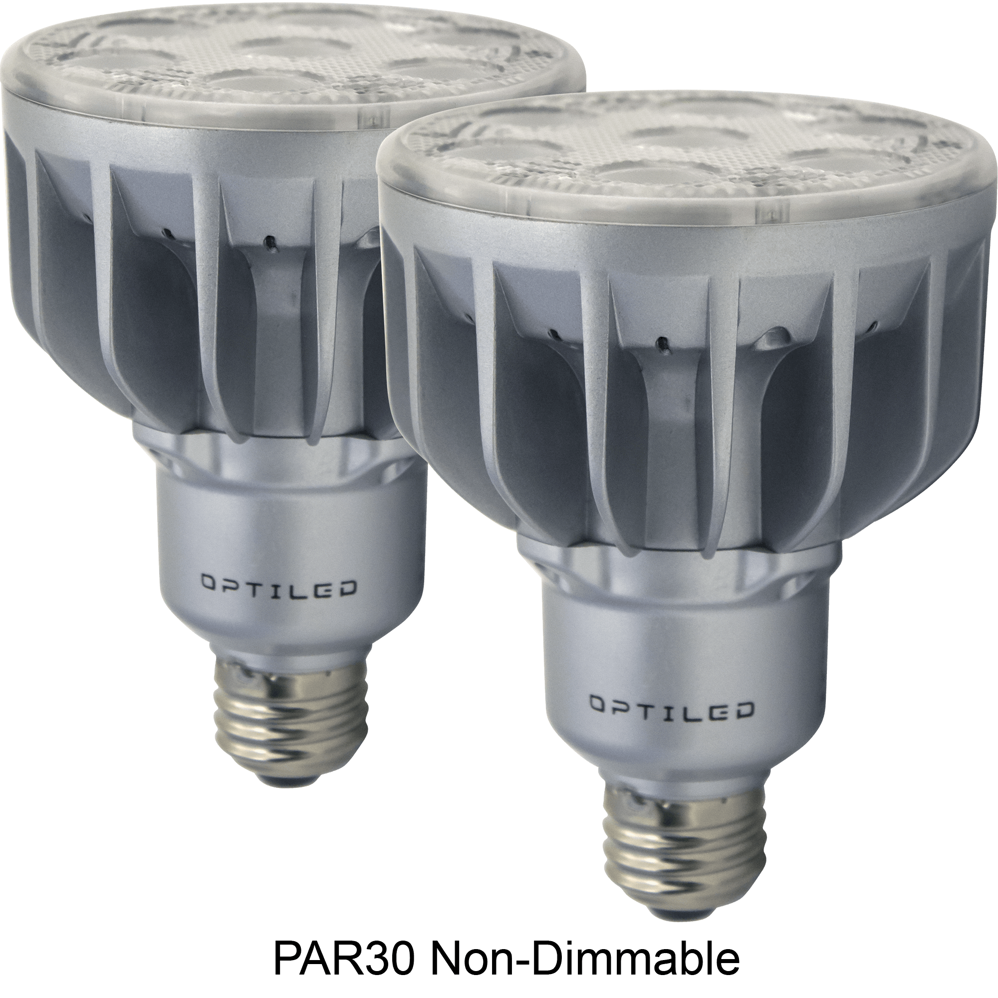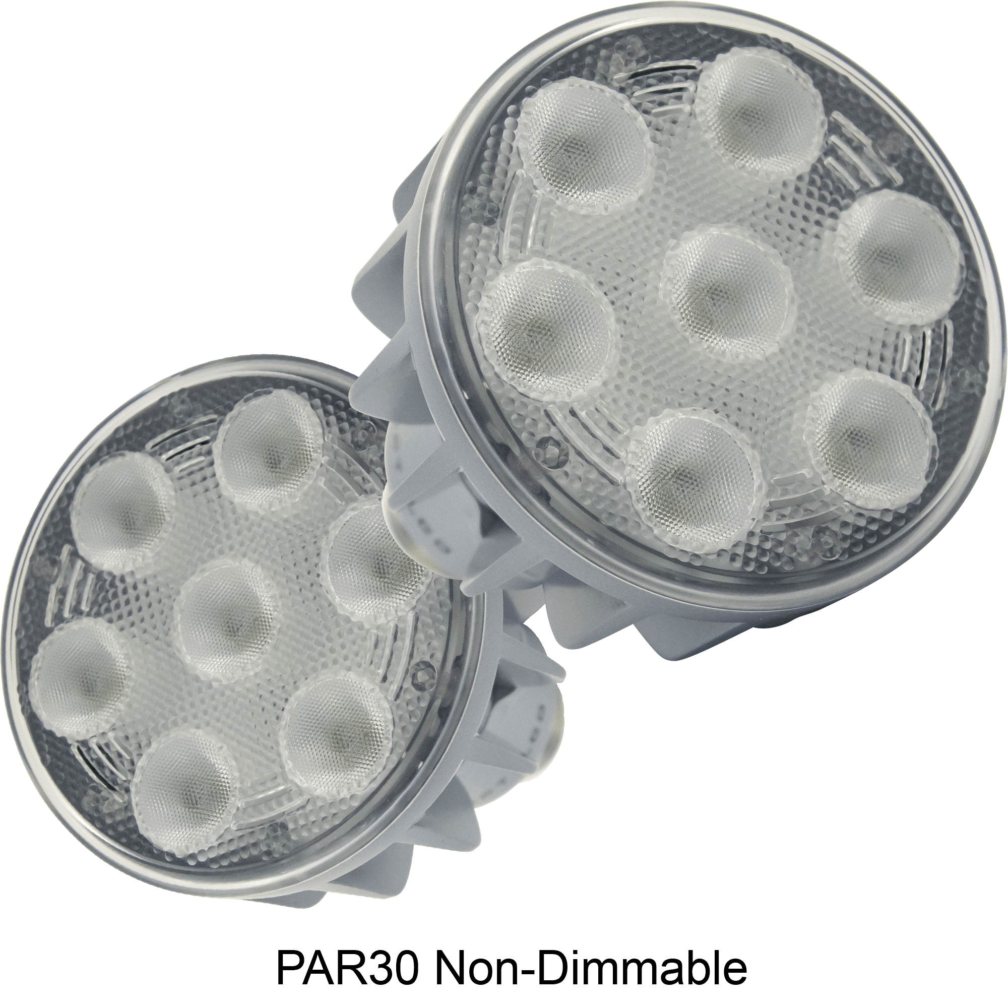 Specs ====Dimmable- Model: 1504280121- Temperature: 2700K (Warm White)- Color accuracy (CRI): 80- Size: PAR30- Screw type: E26- Amps: 180mA- Voltage: 120- Watts: 14.5- Average Life: 35,000 hr.- Halogen Equivalent: 65W- Indoor/Outdoor: Indoor- Lumens: 720- Lumens per watt (efficacy): 50 - Beam angle: 24- Made with Cree LEDs - Lamp Type: Reflector- Max. Overall Length: 5"- Made with Cree LEDs Non-Dimmable - Model: 1504050217 - Color temperature: 2,988K (warm white/daylight) - Color accuracy (CRI): 83 - Size: PAR30 - Screw type: E26- Amps: 230mA - Voltage: 100-240 AC - Watts: 11W - Average life: 35,000 hours - Halogen Equivalent: 50-60W Incandescent - Environment: Indoor - Luminous output: 554 - Lumens per watt (efficacy): 50 - Luminous intensity (cd): 2100 - Beam angle: 28 - Made with Cree LEDs - 6" long- Manufacturer specs - More manufacturer specs- (variances between manufacturer specs and these listed specs come directly from the packaging) Condition: New Warranty: 90 Day Mediocre Estimated Delivery: 4/23 - 4/28Shipping: $5 or free with VMP What’s in the Box? ====2x Dimmable PAR30 bulbor2x Non-dimmable PAR30 bulbPictures ====Non-dimmableDimmableTop of dimmableTop of non-dimmableAlternate views of allAn old melonPrice Check ====$45.98 (for 2) for similar at Amazon$49.98 (for 2) for similar at Amazon