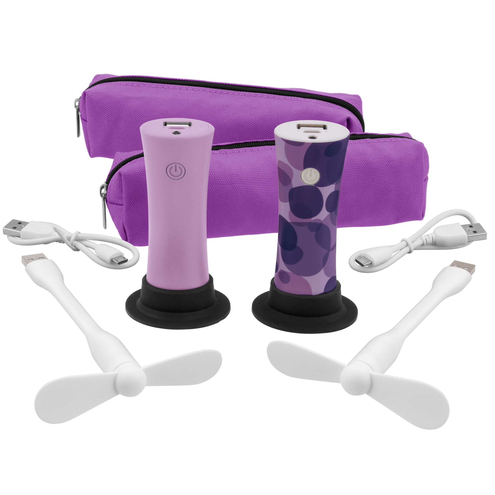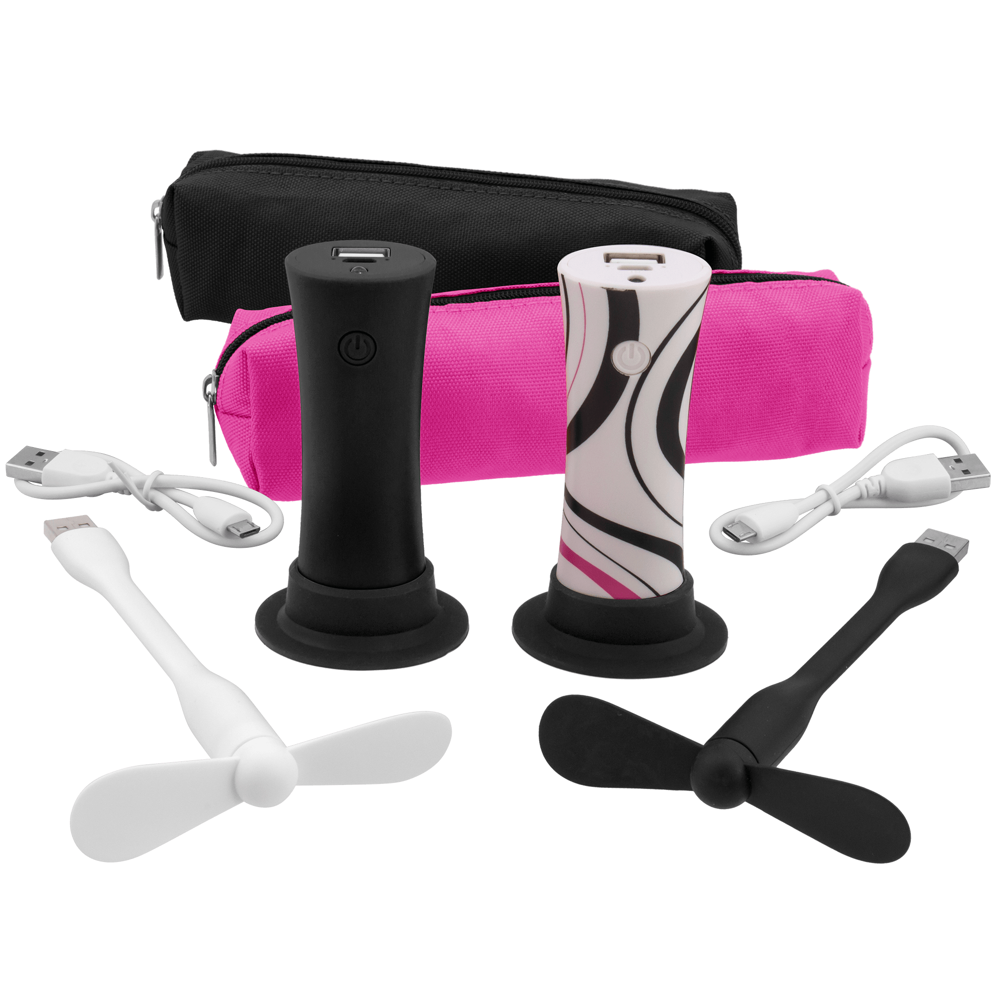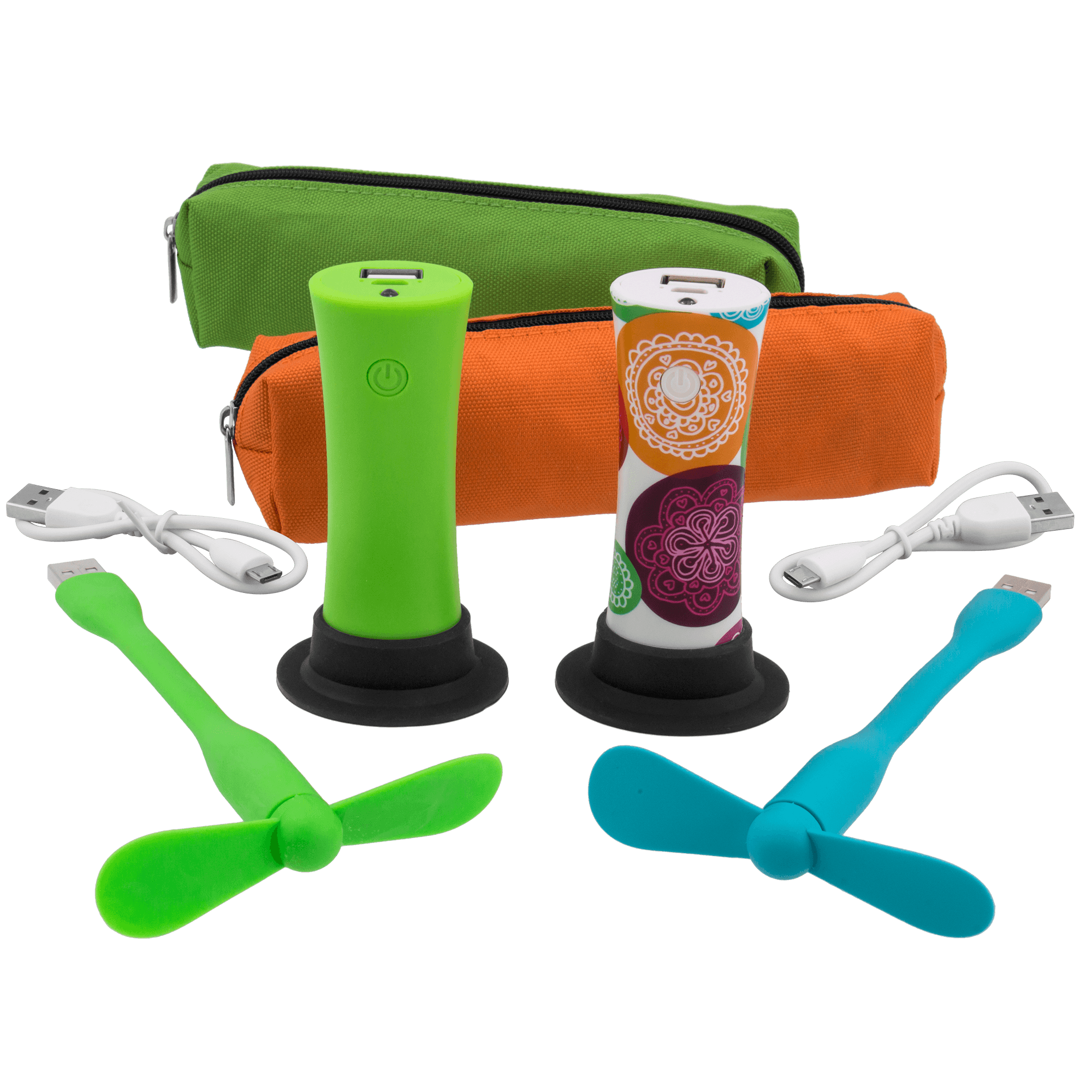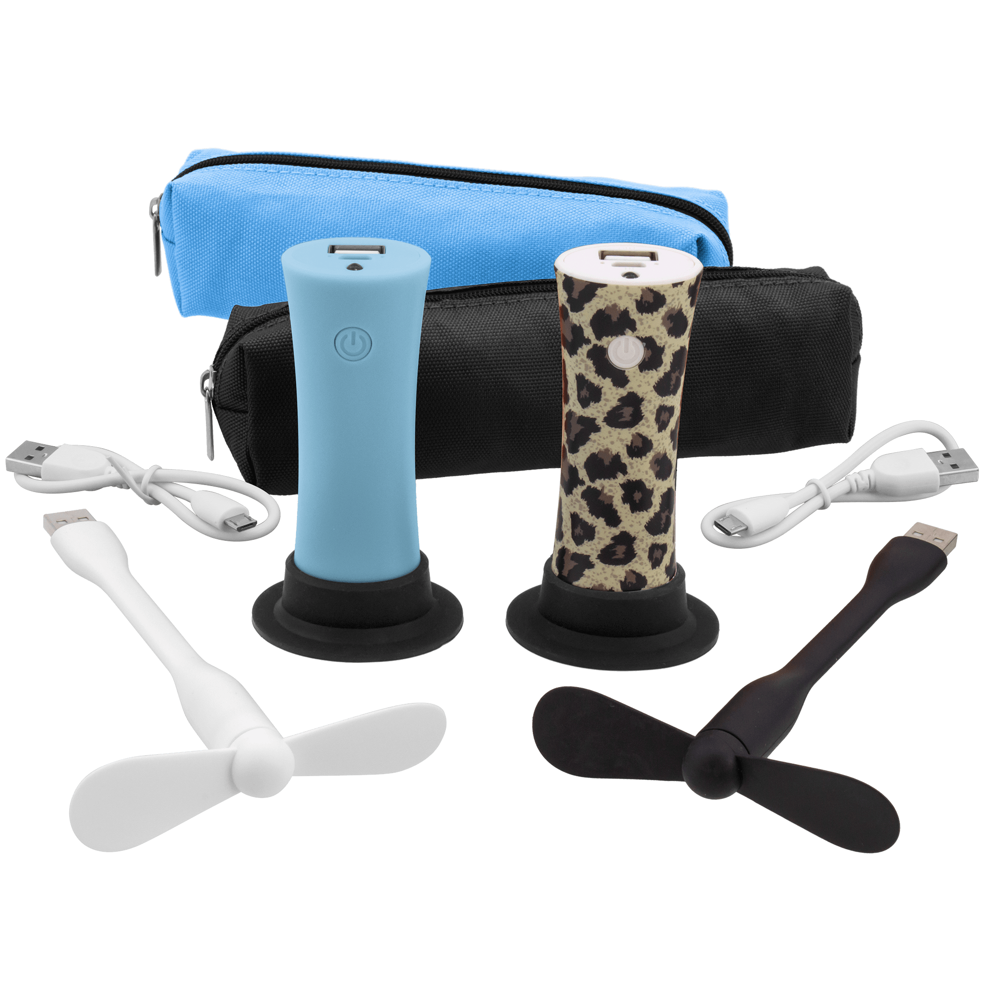 Specs ====- Model: VBF01H- Condition: New- Battery capacity: 2600mAh - Charging time: 3 - 5 hours - Battery dimensions: 1/4" x 1" x 3.75"- Flexible fans can be powered by any USB device- Integrated LED flashlight built into each power bankWhat’s in the Box? ====2x Powerbanks 2x USB fans 2x Silicone bases 2x USB to Micro USB charging cables 2x Zippered casesPictures====Red White and BlueChargingFlashlightLilac and purpleFanTeal and blackGreen and OrangeLeopard and sky bluePink and blackAlienPrice Comparison====$14.95 at HSN$34.99 at AmazonFind a relevant price comparison? Please share it in a comment in this thread