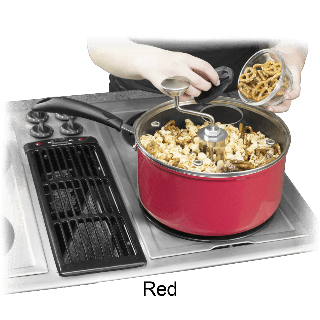 This is a rip off of the Whirly Pop, which you should buy instead. In addition to supporting the originator of a great idea you won’t burn yourself with a poorly placed but patent-avoiding rotator.