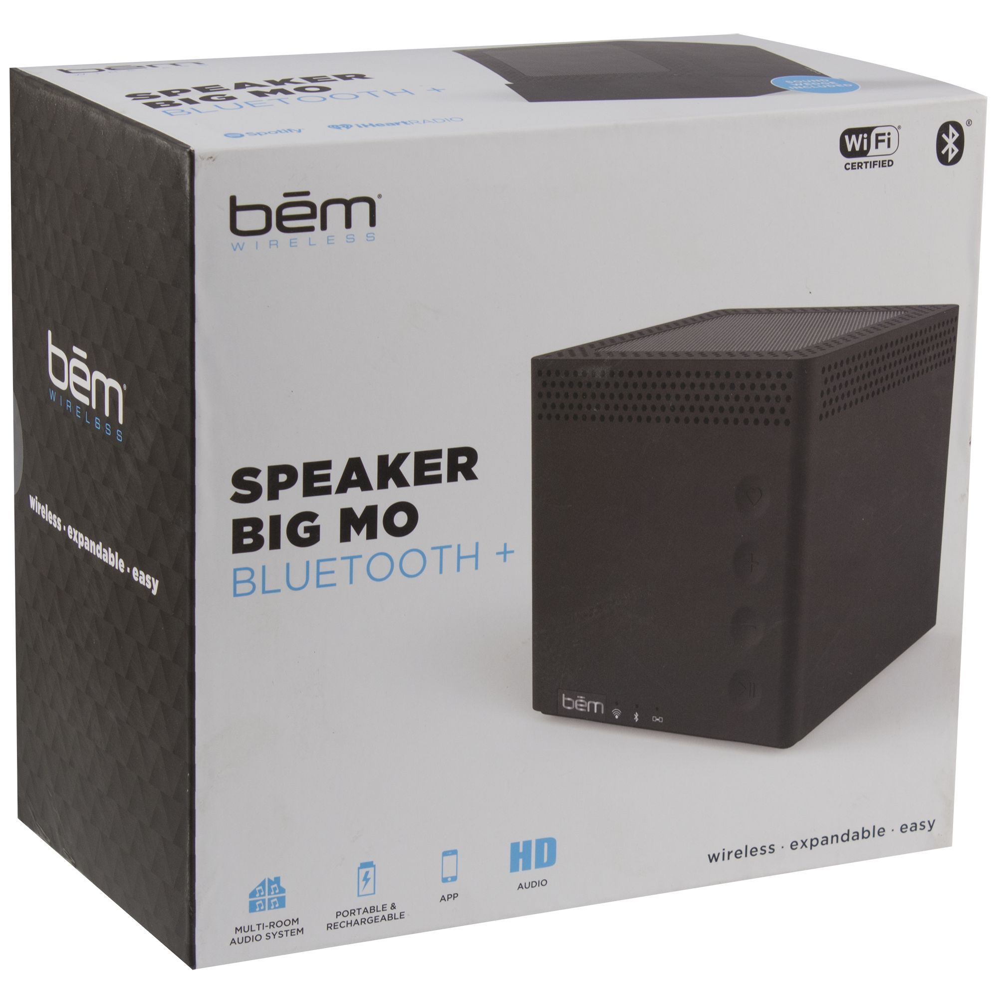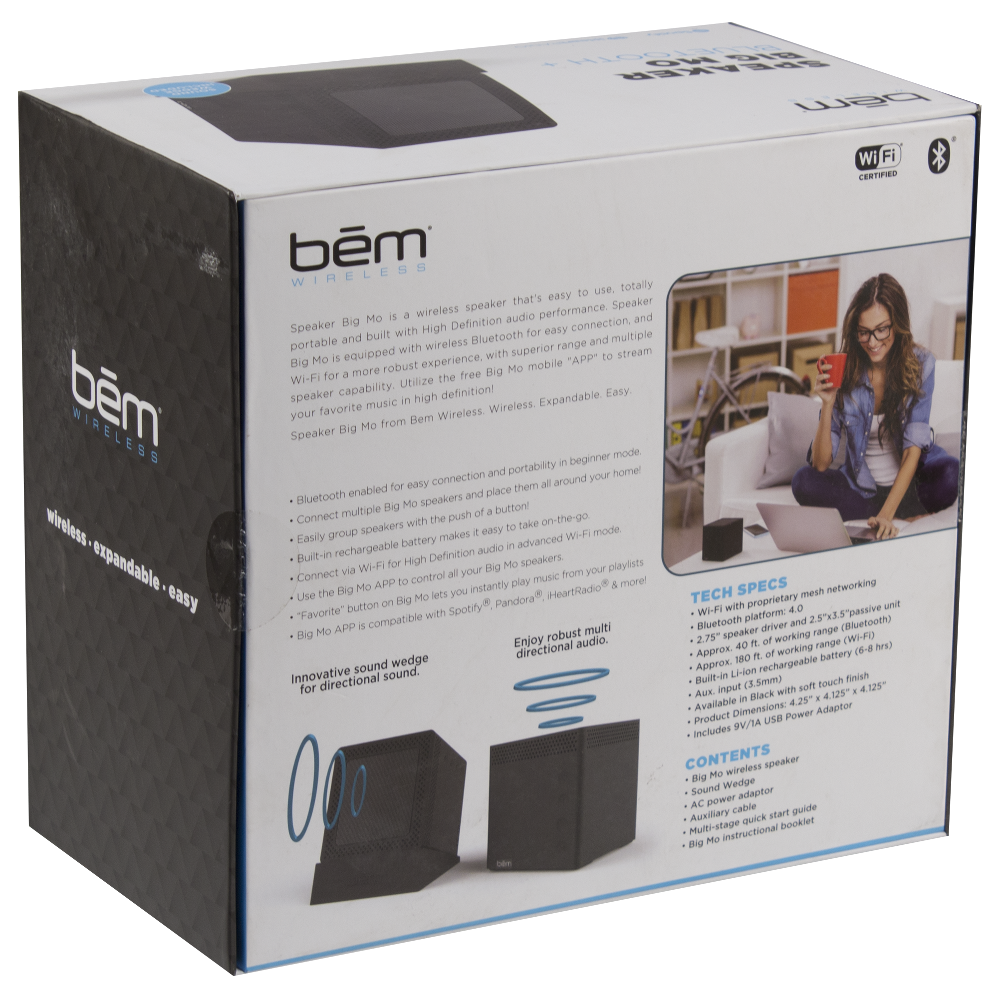 Specs ====- Model BE7000 - Condition: New- Battery: Rechargeable 3.7V, 2000 mAh - Charging Time: 2-3 Hours- Playback Time: 8 hours- Bluetooth Range: 40 Feet- WiFi Range: 180 Feet- 2.75" speaker driver with 2.5"x3.5" passive woofer- Big Mo App compatible with Spotify, Pandora, iHeartRadio & More- Dimensions: 4.25" x 4.125" x 4.125"- User Manual What’s in the Box? ====1x Big Mo BE7000 Speaker System 1x Sound Wedge 1x AC Power Adapter 1x Auxiliary Cable 1x Multi-Stage Quick Start Guide 1x Big Mo Instructional BookletPictures====SpeakersOne speakerSideBackFrontStuffCan for scaleWedge and can for scaleBoxBack of boxGrouchoPrice Comparison ====$213.40 (for 2) at Amazon