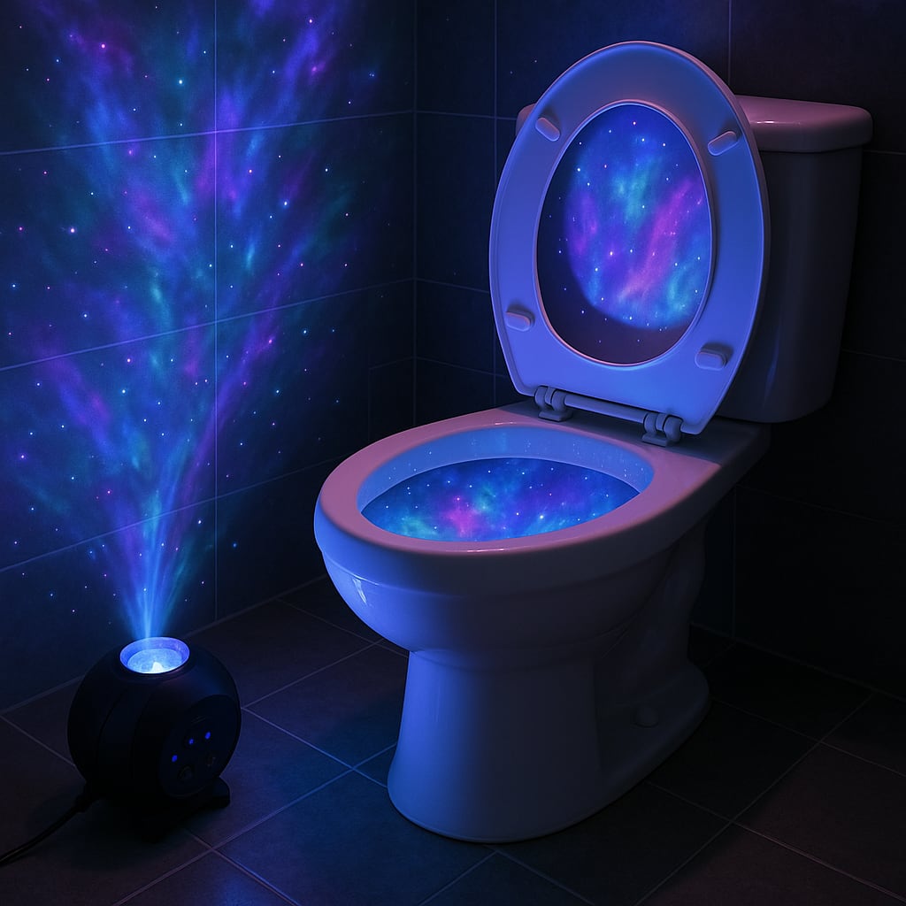 /showme a Nebula Cloud Projector shining it’s beam into a toilet with an open seat.