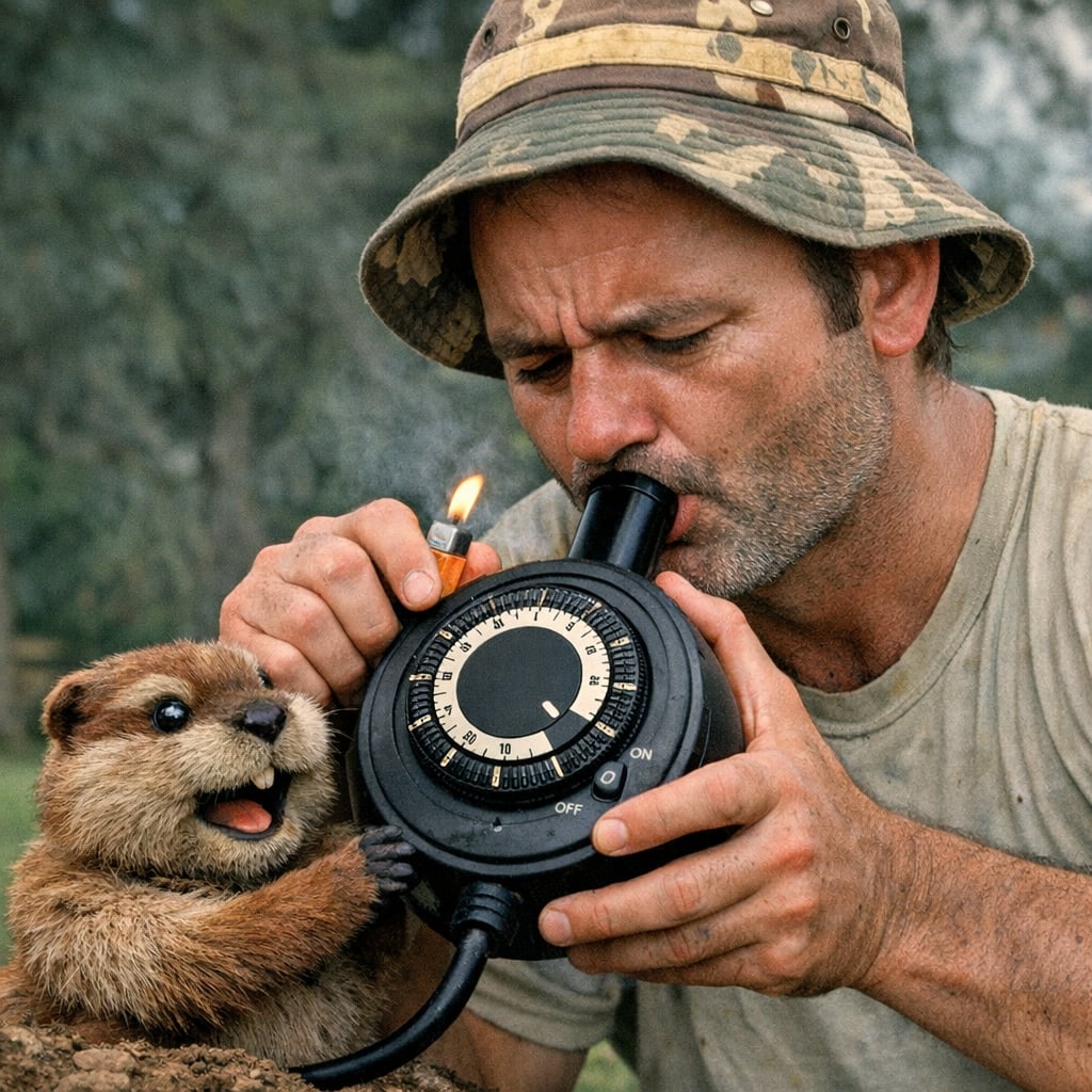 /showme the caddyshack gopher and groundskeeper carl spackle using a black circular corded outdoor water resistant lighting timer as a bong