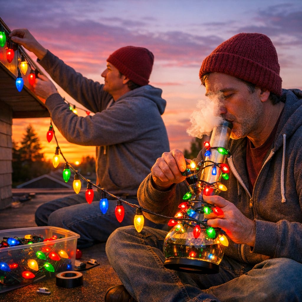 /showme parent on flat roof at sunset stringing colorful holiday lights enjoying a string of colorful holiday lights bong