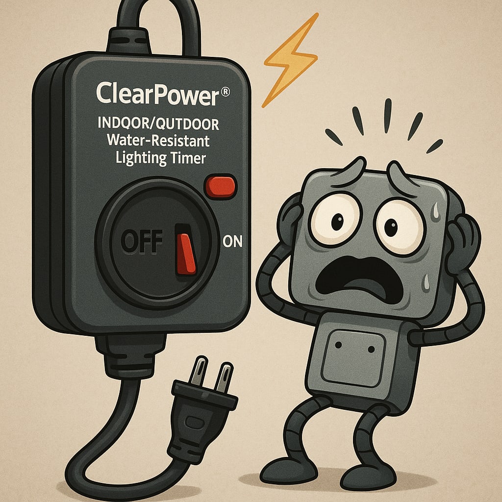 /showme scared mediocrebot attached to ClearPower Indoor/Outdoor Water-Resistant Lighting Timer that is about to shut off.