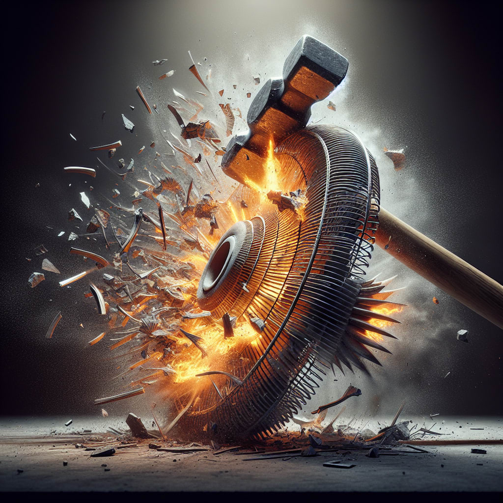 /showme a hammer smashing an imploding flaming fan