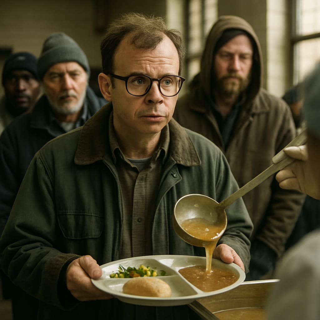 /showme Rick Moranis in soup kitchen line.
