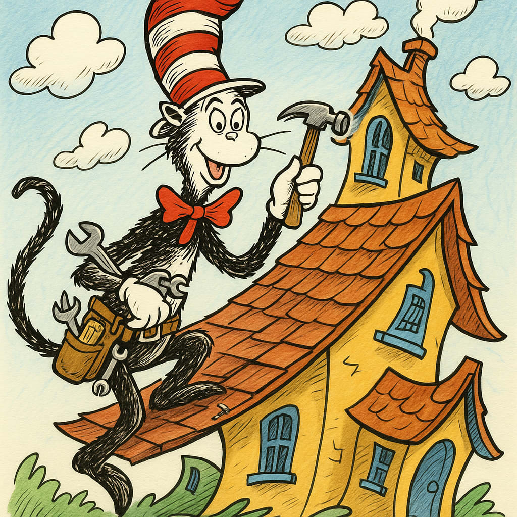 /showme Dr Seuss Cat in the Hat wearing tool belt and fixing roof on crazy looking house.