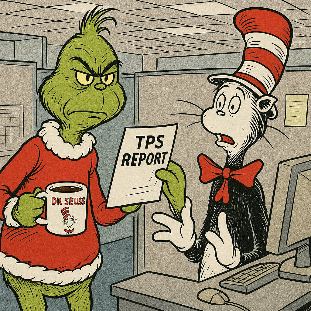 /showme Mr Grinch holding Dr. Seuss mug and demanding TPS report from Cat in the Hat in office cubicle.
