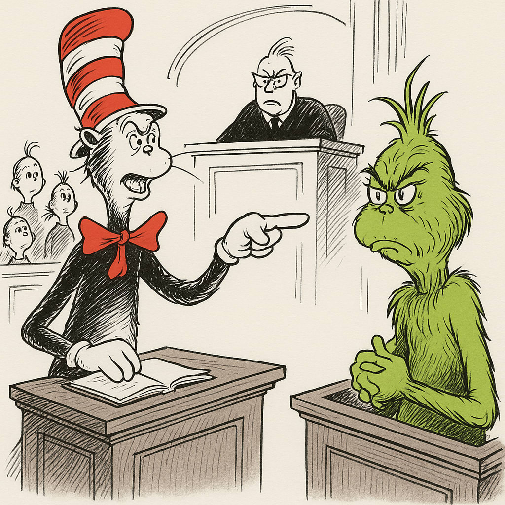 /showme Dr. Suess Cat in the Hat as lawyer prosecuting Mr. Grinch in court.