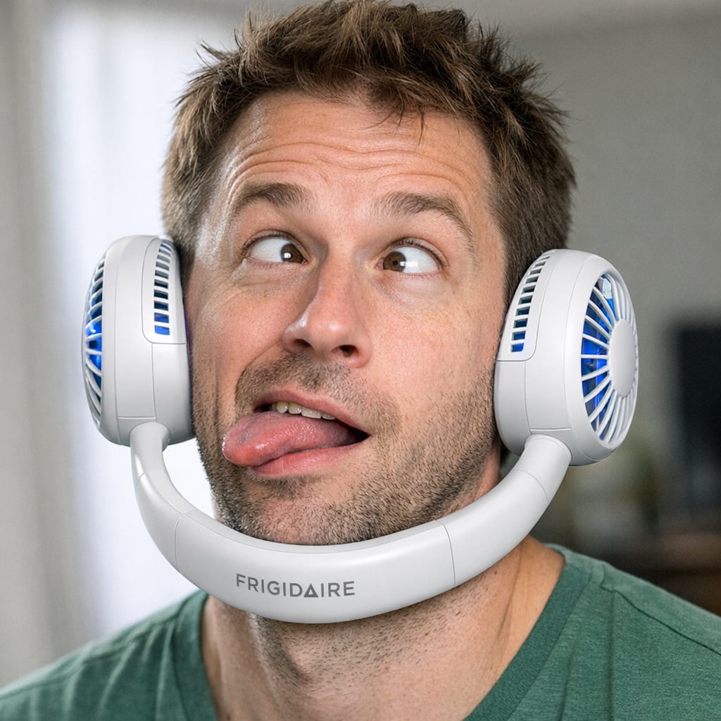 @cfg83 Here’s the image you requested for “Frigidaire Portable Neck Cooling Fan being worn over the ears of a silly human.”