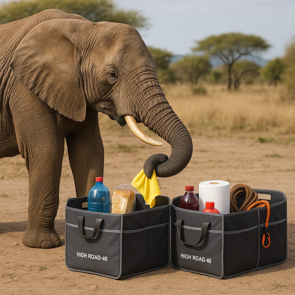 /showme a realistic African elephant using his trunk to put items into a pair of High Road 40" Expand-to-Fit Car and SUV Trunk Organizers.