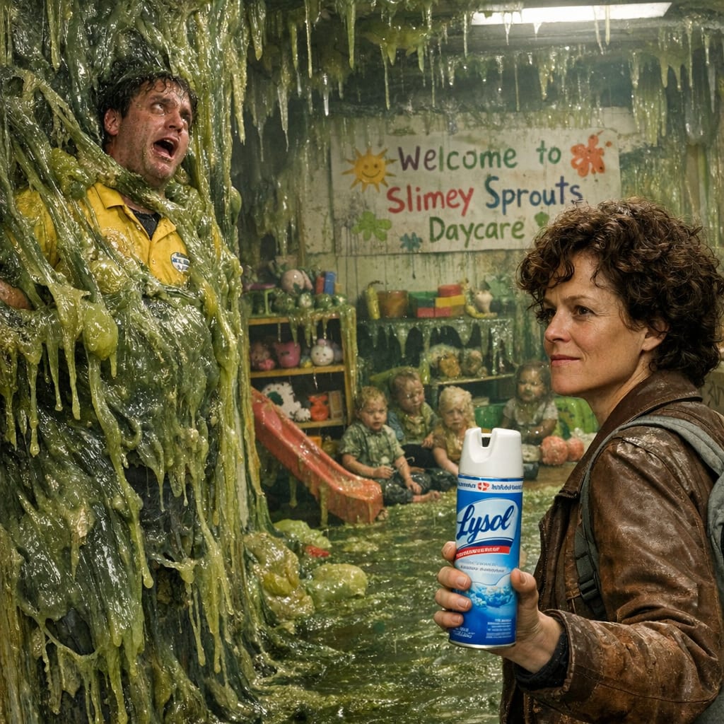 /showme the most mucus-y day care, with one employee attached to the wall like the marine in aliens, and ripley, dressed as a parent arriving to pick up her child, has not a flamethrower but a can of lysol