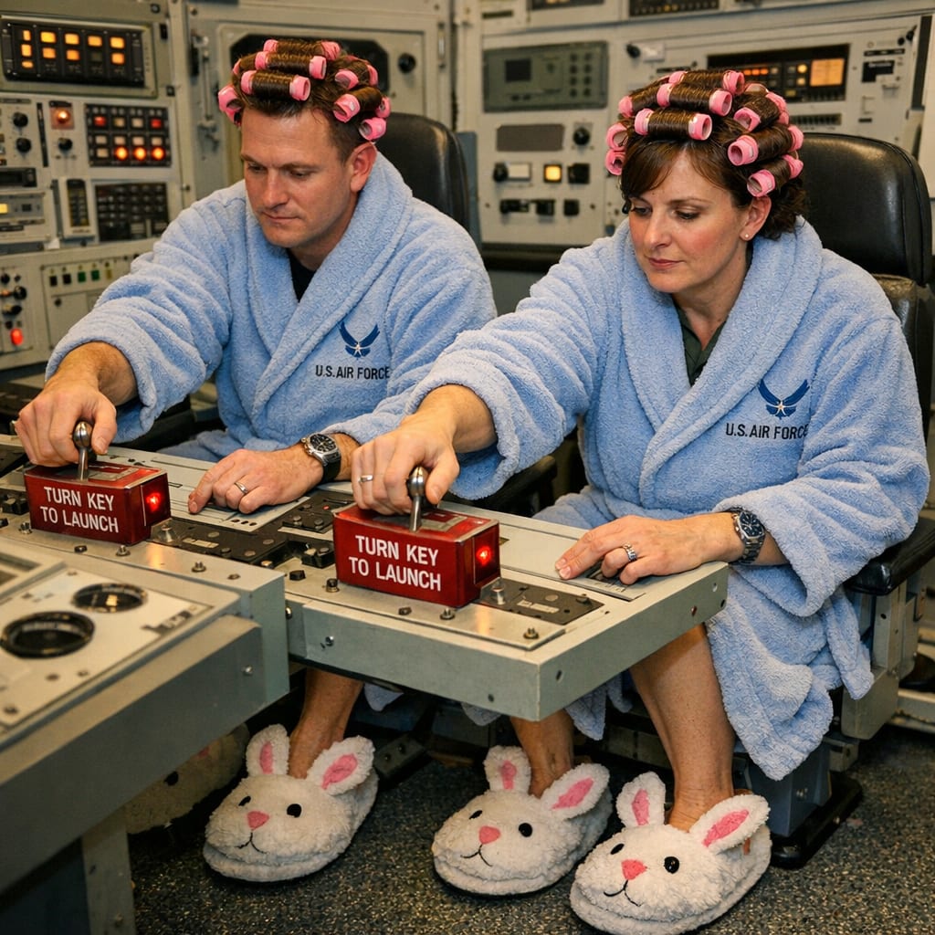 /showme two missile silo officers in bunny slippers, us air force bath robes, and curlers turning the launch keys simultaneously
