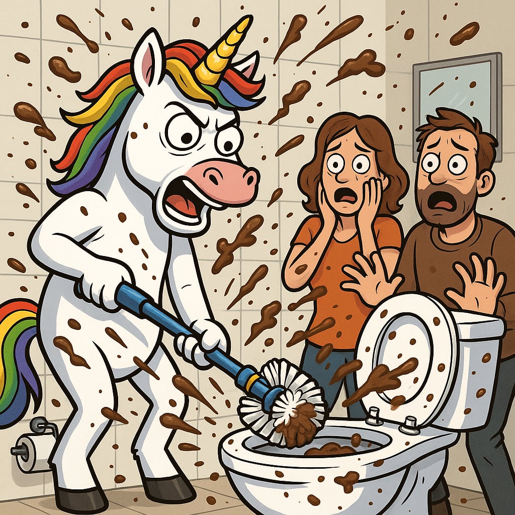 /showme a colorful Unicorn using a high-powered rotating toilet brush to clean a toilet bowl and there is feces being scattered everywhere causing horrified looks from the homeowners.
