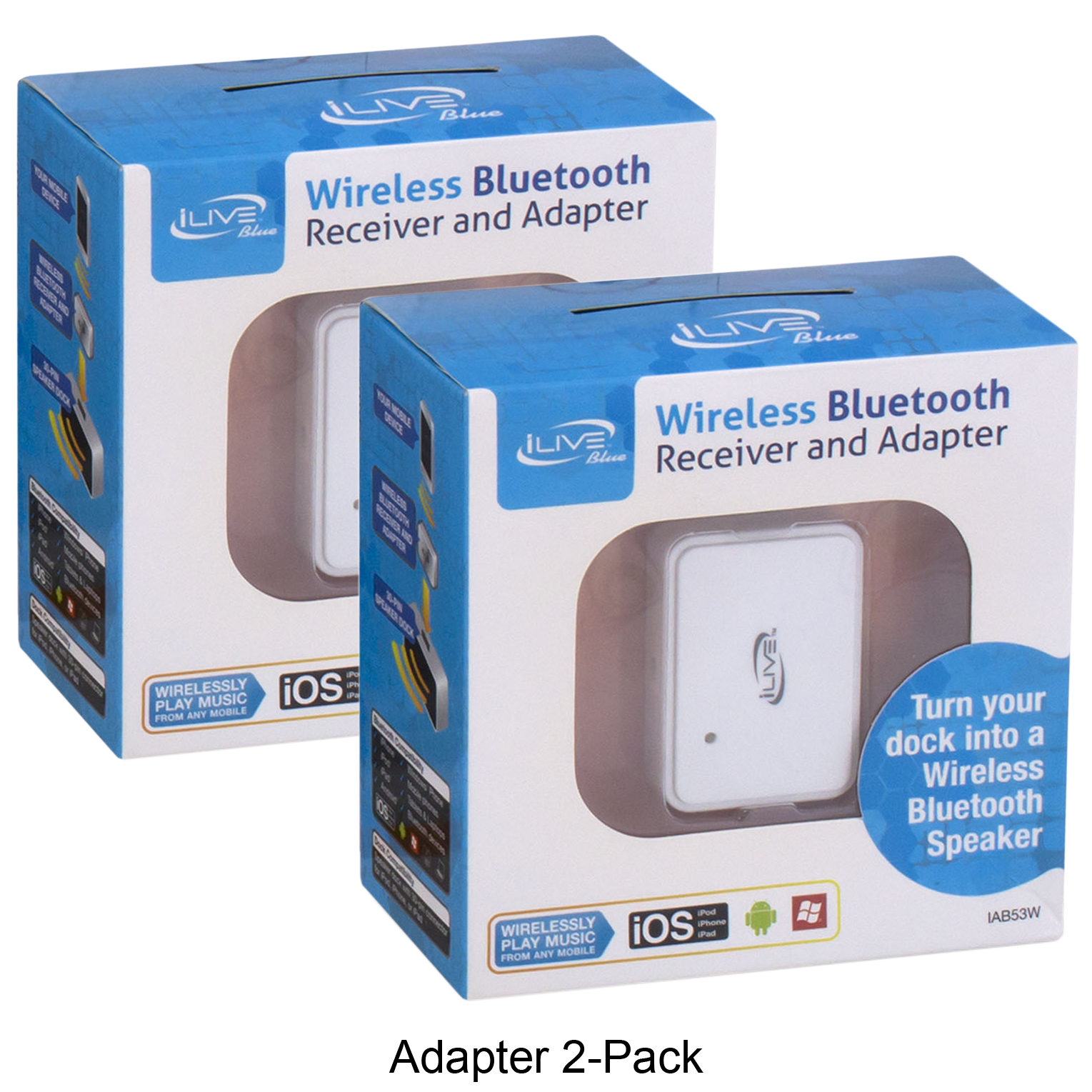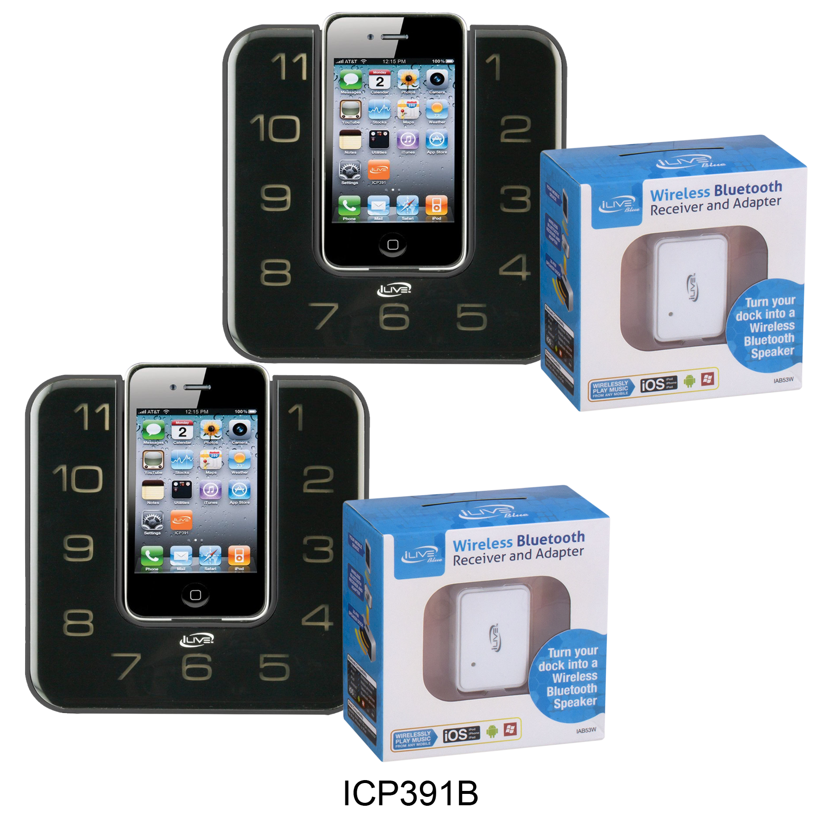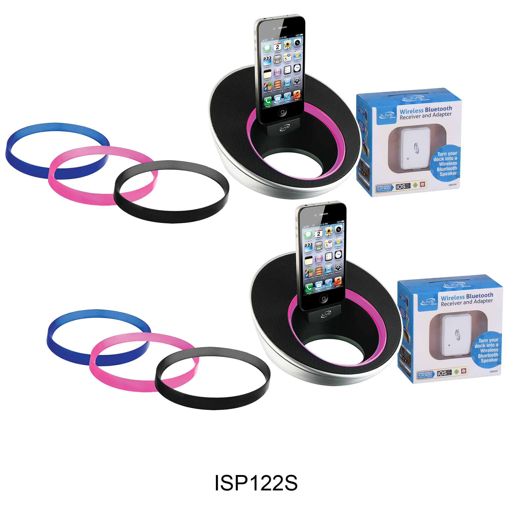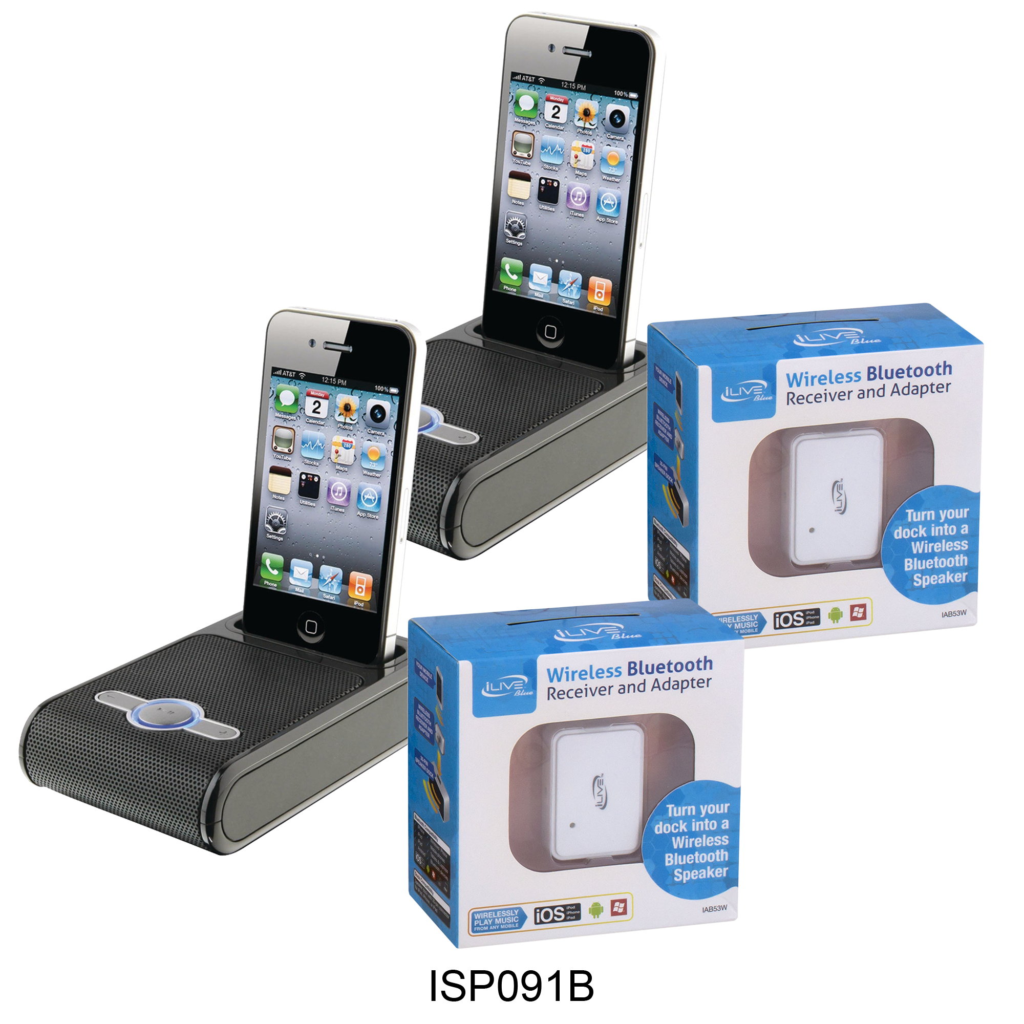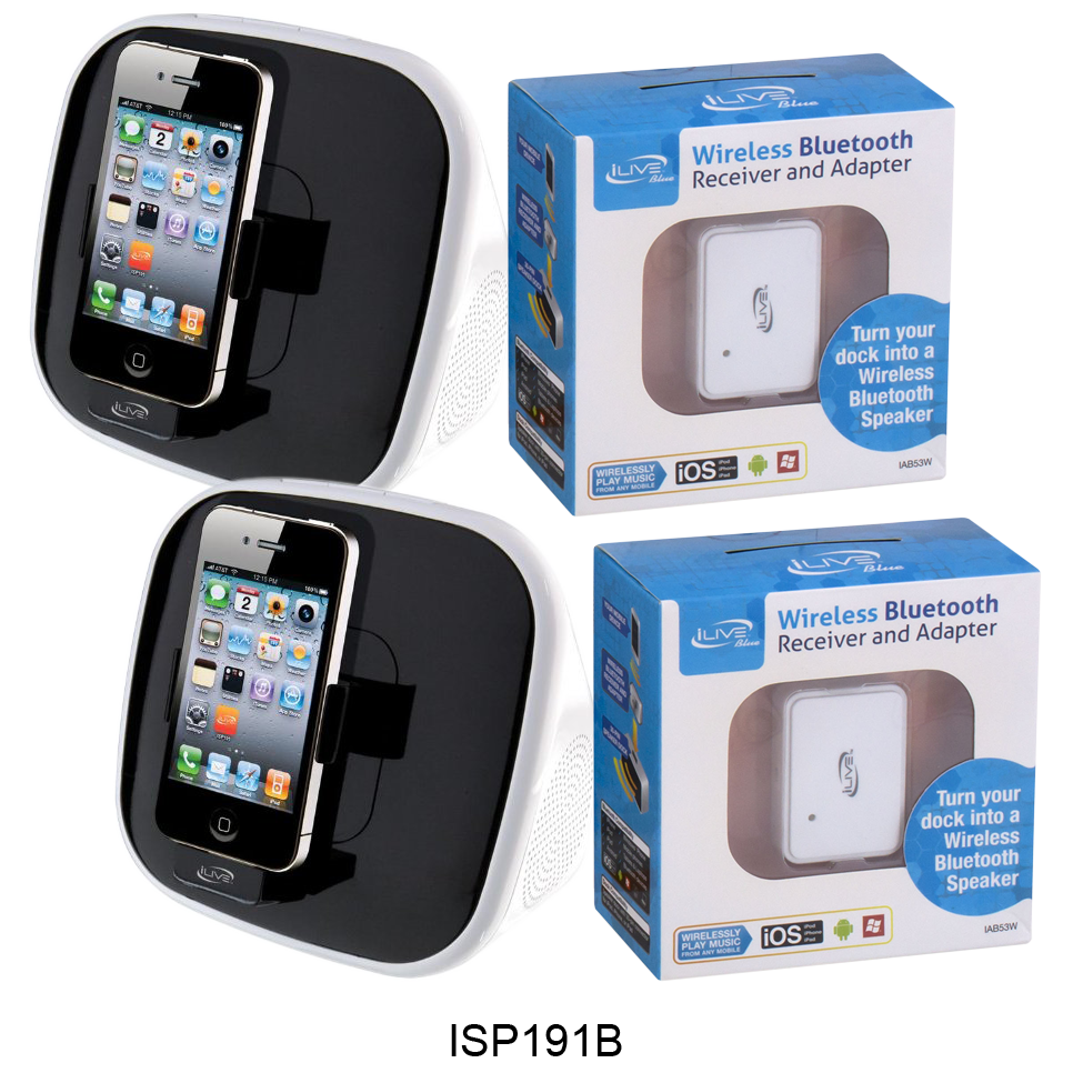 Specs ====- Model: IAB53W, ISP091B, ISP191B, ICP391B, ICP232B, ISP122S- Condition: New- ISP091B - Aux Input - Digital volume control - Battery power requires 4 AAA batteries- ISP191B - Rotating dock for iPod and iPhone for portrait or landscape orientation - Composite video output - Aux Input - Digital volume control- ICP391B - “App enhanced” - FM Radio (PLL) - Dual alarm - Negative LCD display with white backlight - Aux Input - Gradual wake to iPod and iPhone, radio, and alarm - Digital clock - Sleep timer - Snooze - Dimmer control - Digital volume control - Station memory presets (10 FM) - Last user’s setting memory - Full-function remote- ICP232B - Digital FM Radio (PLL) - Dual alarm - Red LED display - Mechanical analog clock with fluorescent clock arm - 3.5mm audio input - Gradual wake to iPod and iPhone, radio, and alarm - Wake to iPod, iPhone, radio, or alarm - Sleep timer - Snooze - Digital volume control - Station memory presets (20 FM) - Battery backup for clock and alarm: requires 2 AAA batteries (not included)- ISP122S - Three interchangeable color accents - Aux Input - Digital volume controlWhat’s in the Box? ====2x Speaker Docks2x Bluetooth AdaptersPictures====OptionsICP232PICP391BISP091BISP122SISP191BAdapter 2 packScatteredPrice Comparison====Bluetooth: $19.06 (for 2) at AmazonISP091B: $25.90 (for 2) at AmazonISP191B: $25.96 (for 2) at AmazonICP391B: $37.24 (for 2) at AmazonICP232B: $80.56 (for 2) at AmazonISP122S: $199.98?! (for 2) at Amazon