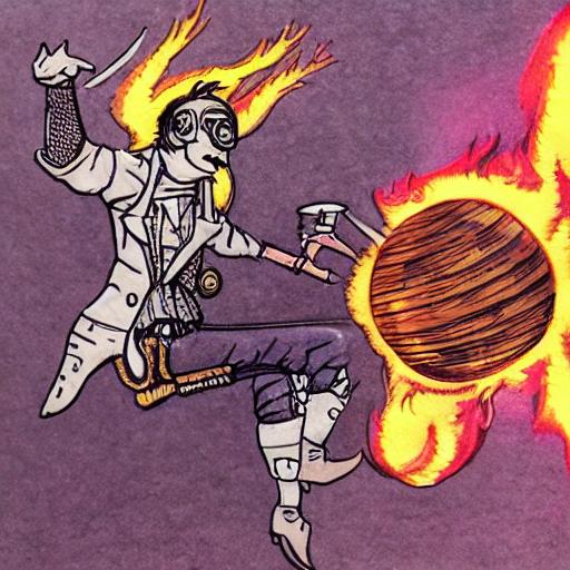 /showme a steampunk style drawing of a person who is an onion soup HA-A8TR riding a flaming asteroid in space.