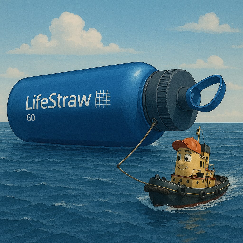 /showme Lifestraw Go Water Filter Bottle the size of oil tanker laying on it’s side and being towed across the ocean by Theodore Tugboat.