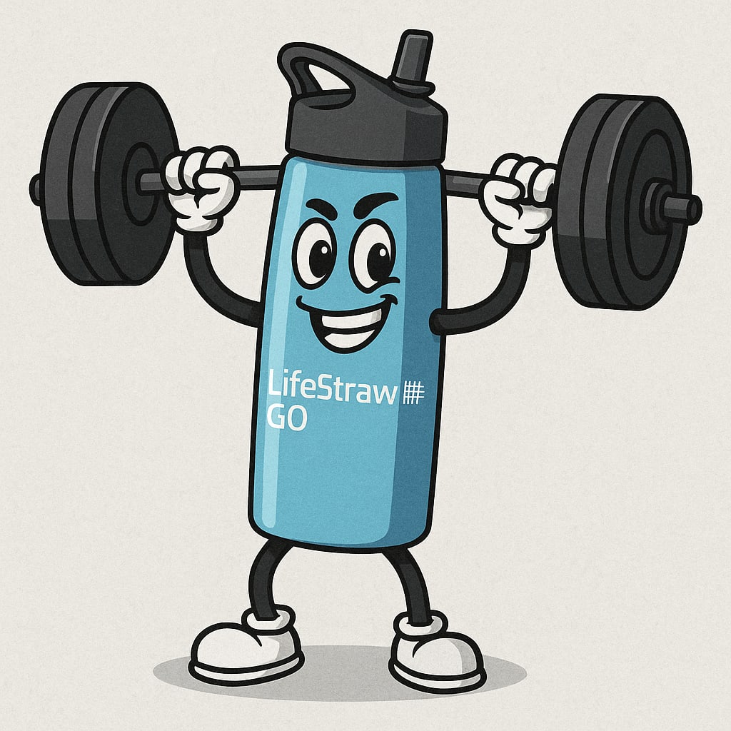 /showme anthropomorphized Lifestraw Go Water Filter Bottle lifting weights.