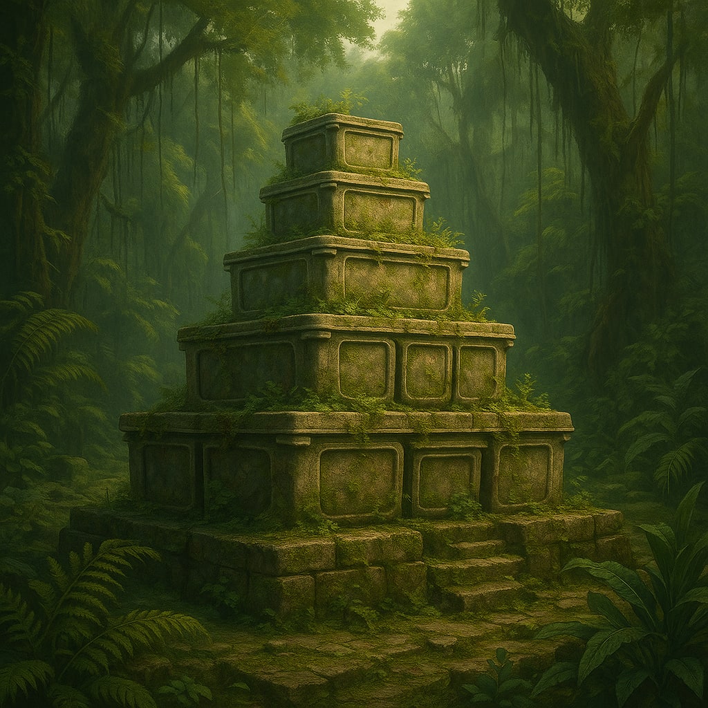 /showme ancient ruin of 10-Piece Square Food Storage Set pyramid in dense jungle.