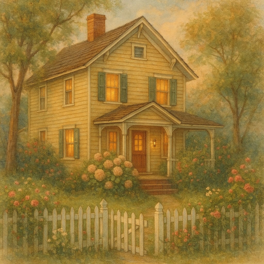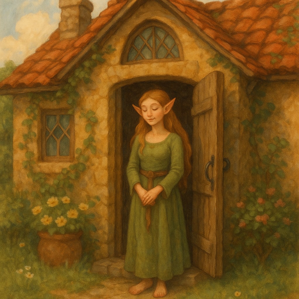 /showme nostalgic endearing house with decent relaxing female elf standing at the door.
