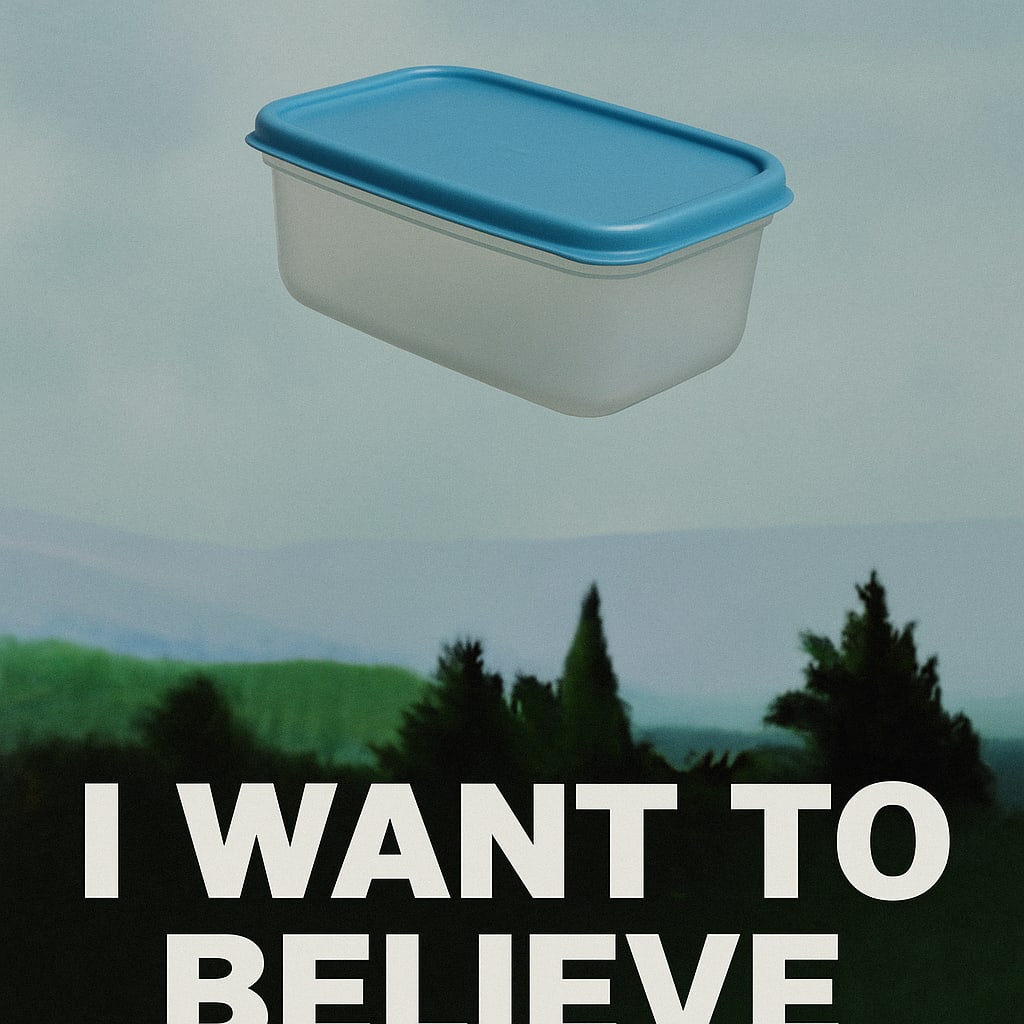 /showme Tupperware floating in air and text below saying “I WANT TO BELIEVE”.