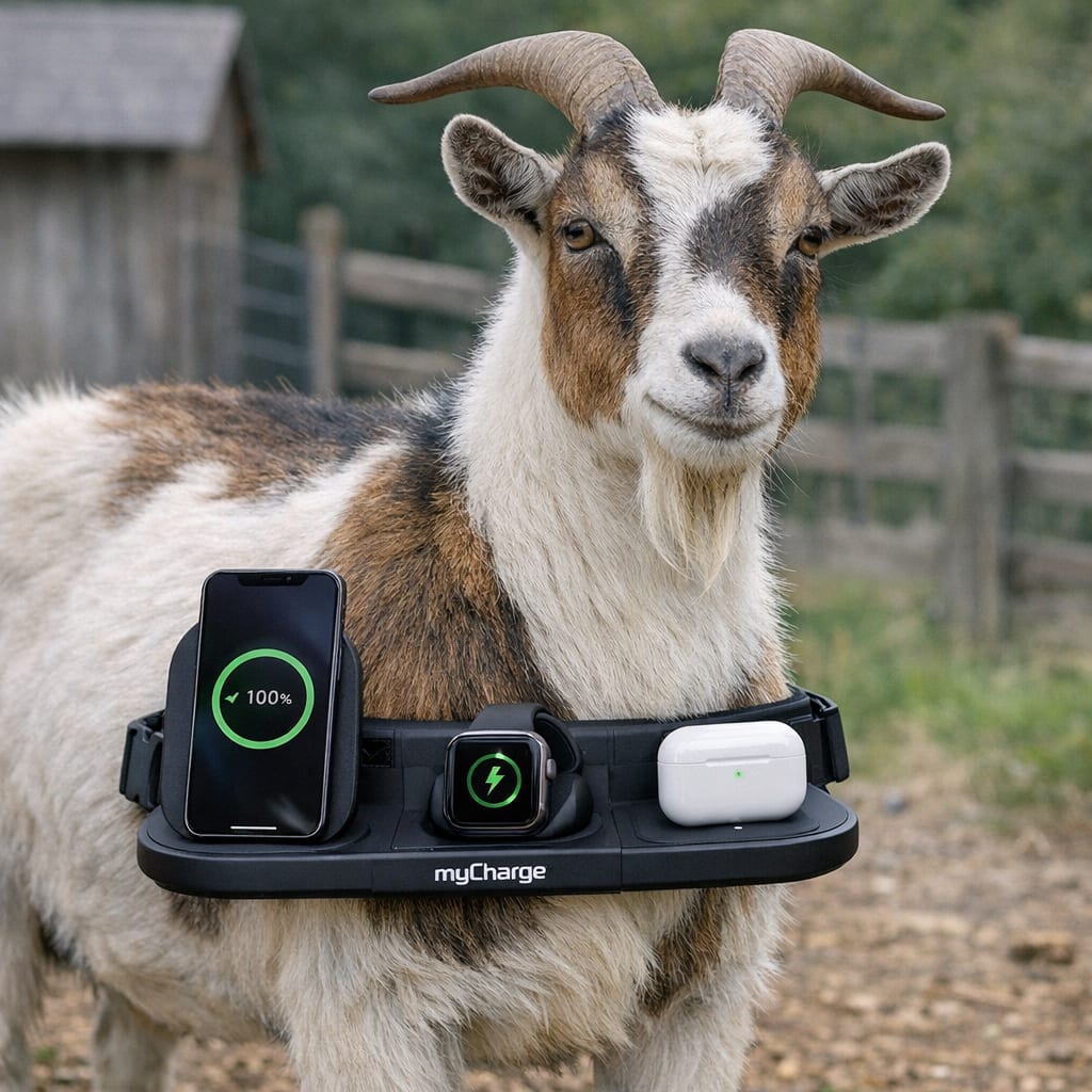 @cfg83 Here’s the image you requested for “Goat wearing MyCharge 3-in-1 Wireless Charging Pad instead of a utility belt.”