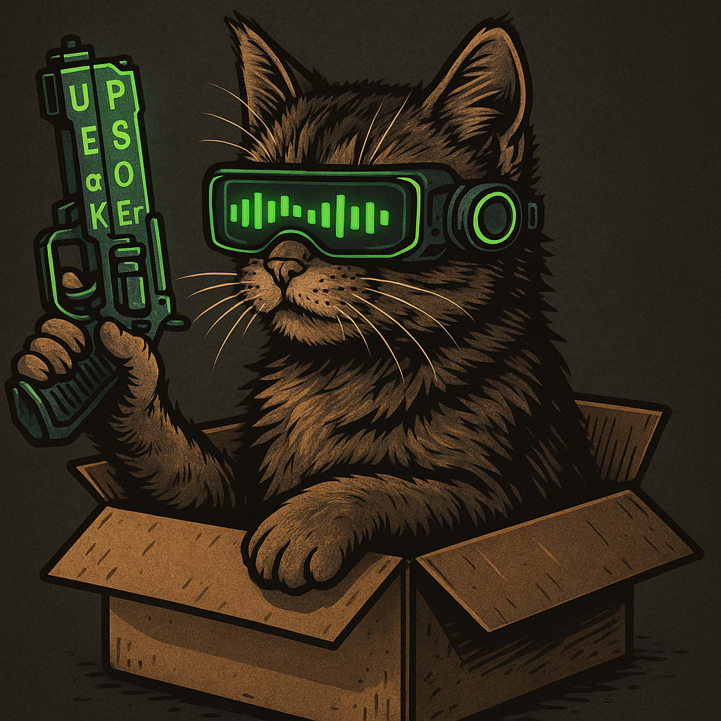 /showme Cat with cyber goggles holding Pistol made of Uranium-Phosphorus-Erbium Sulfur-Oxygen-Alpha-Particle-Potassium-Erbium and sitting in cardboard box.