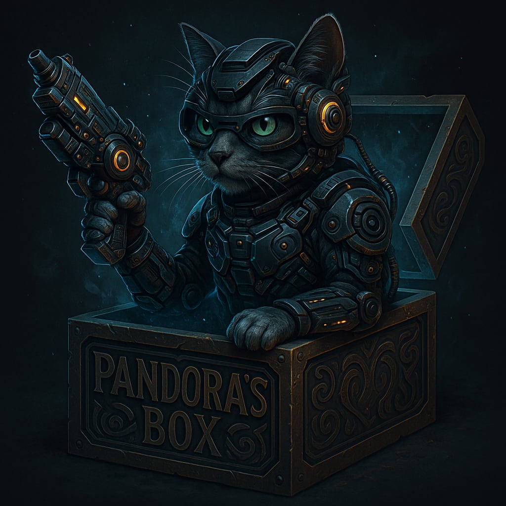 /showme Schrödinger’s cat wearing cyber gear and sitting inside Pandora’s box and holding quantum fusion space blaster.