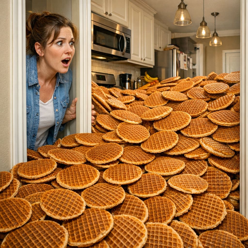 @zippyus Here’s the image you requested for “homeowner can t enter their kitchen overflowing with stroopwafels”
