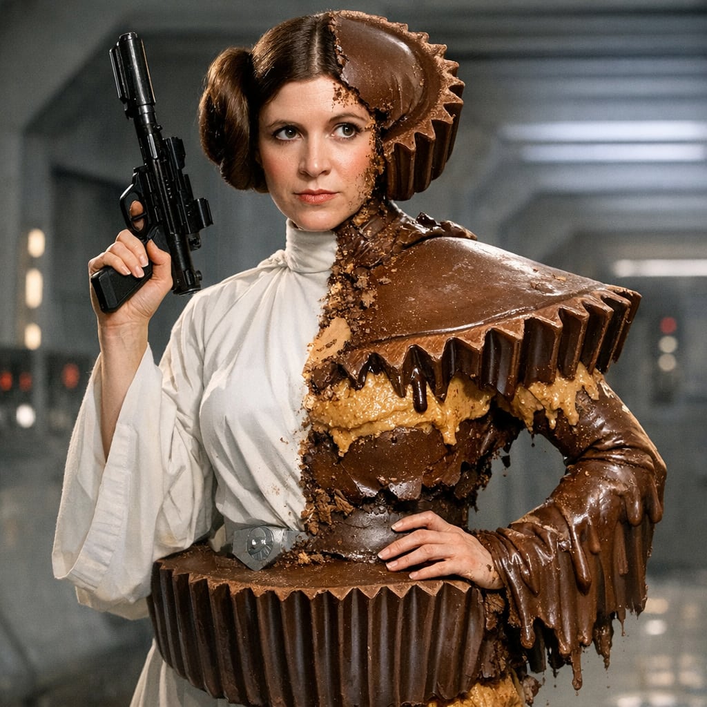 @zippyus Here’s the image you requested for “the half human half confection princess leia organic peanut butter cup from star wars, a new hope.”