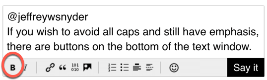 If you wish to avoid all caps and still have emphasis, there are buttons on the bottom of the text window.