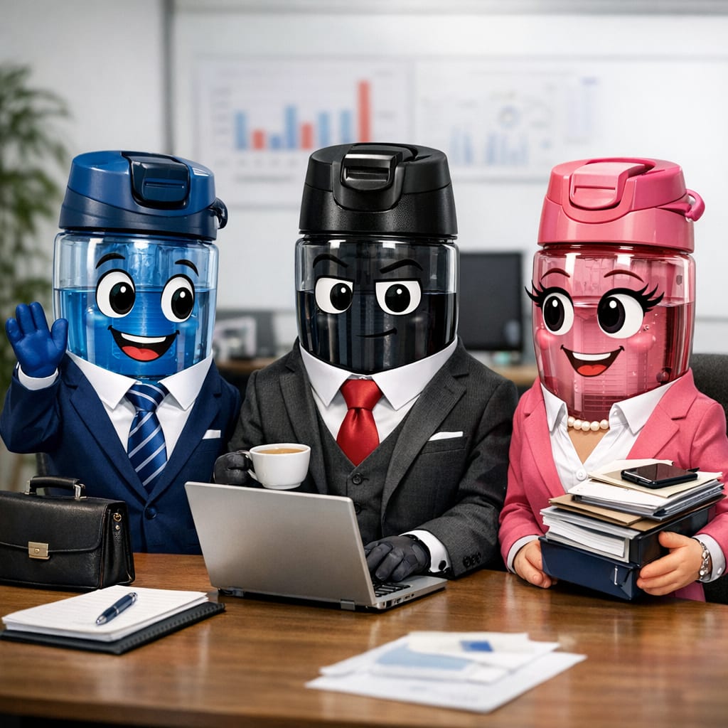 /showme Anthropomorphized Water Filter Bottles made by “nkd” are at an office and dressed in business attire.