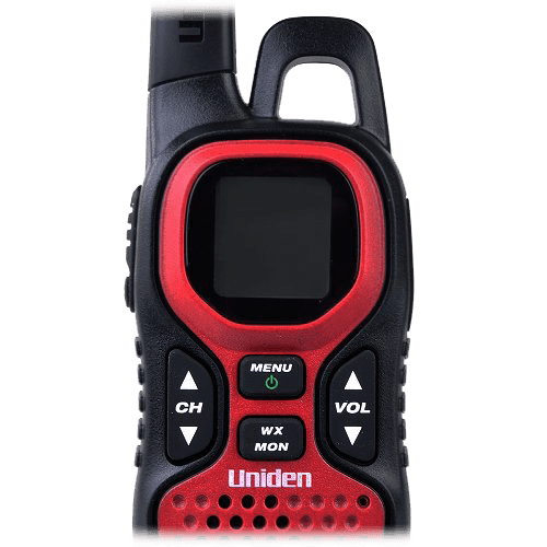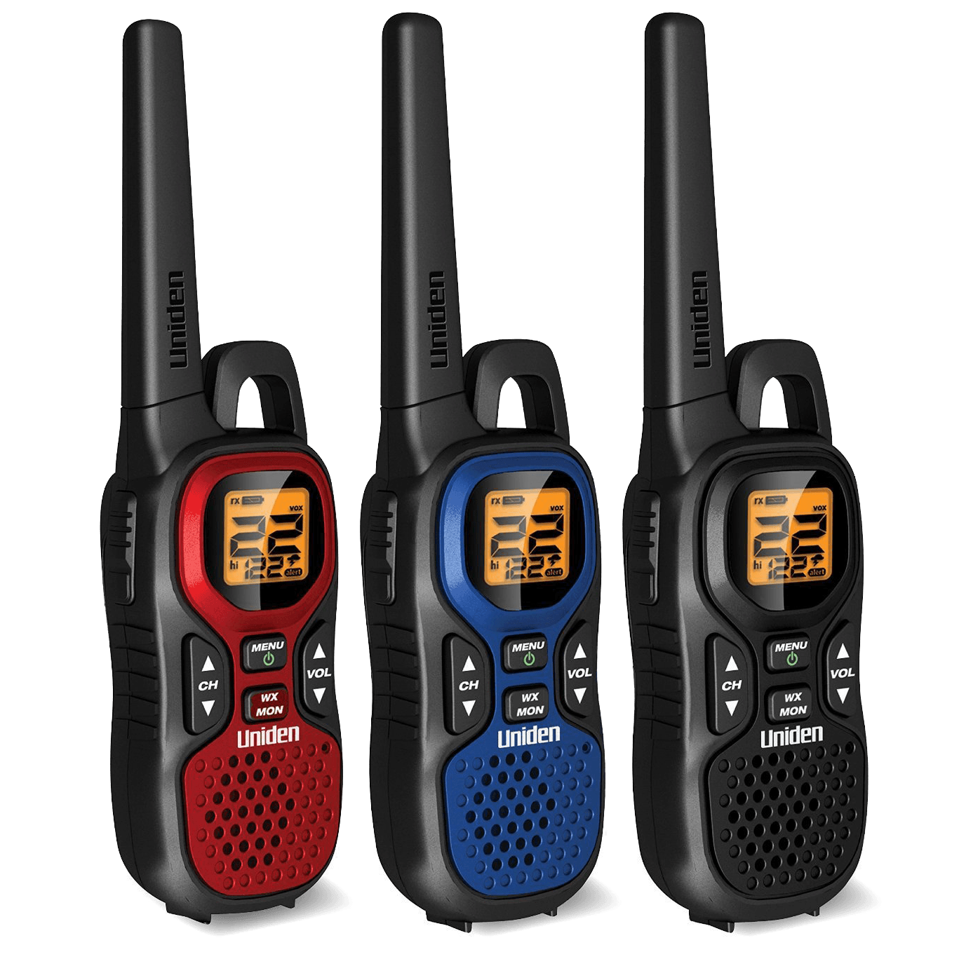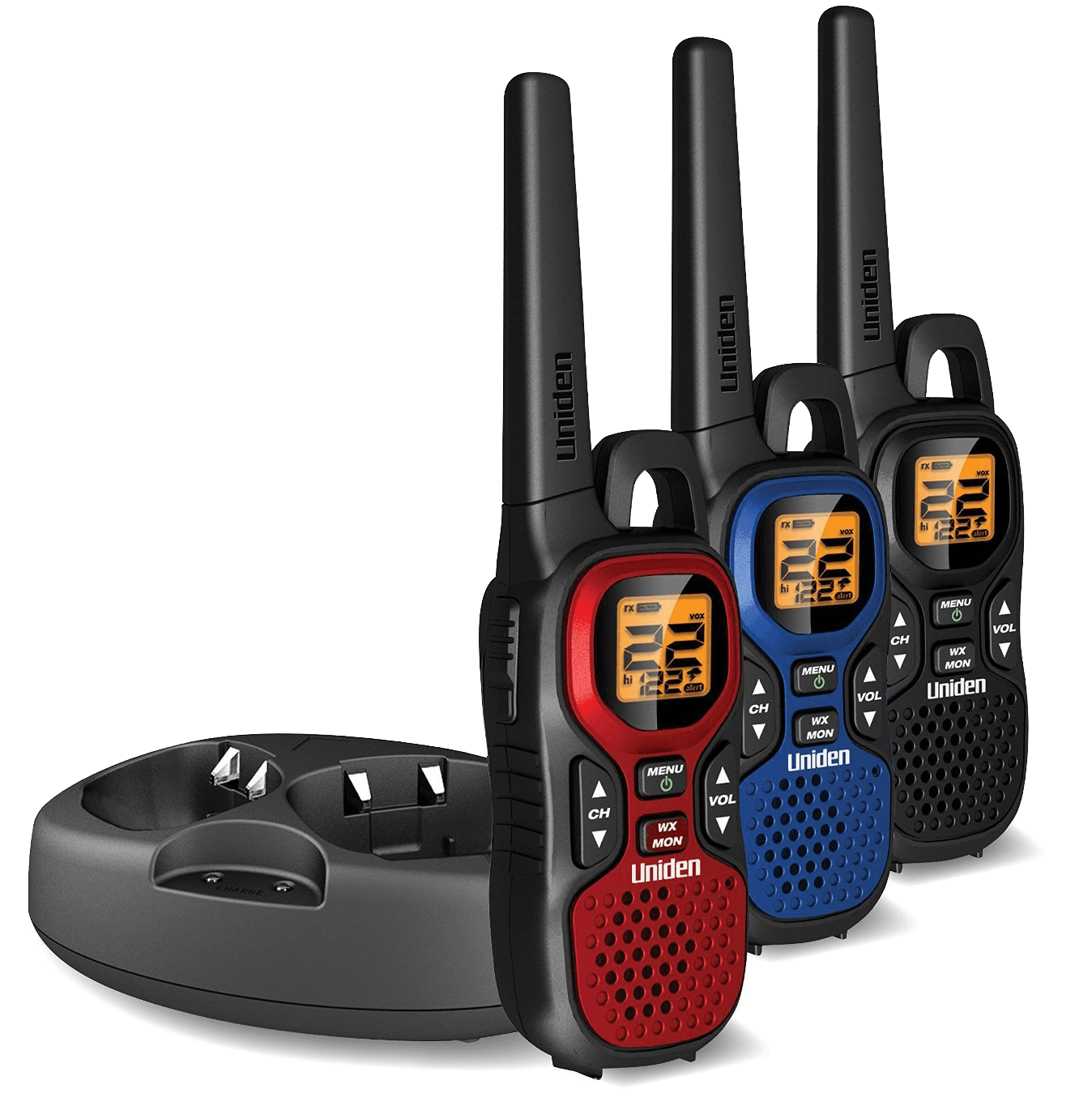 Specs====- Model: GMR3740-3CK- Channels: 15 GMRS, 7 FRS, 7 NOAA Weather- Sub Codes: 38 Sub-Audible Tones, 83 DCS Codes- GMRS/FRS Operating Frequency: 462.5500 - 467.7125 MHz- WX Operating Frequency: 162.4000 - 162.5500 MHz- Power: Rechargeable 3.6v 550mAh NiMH battery or 3x AAA Batteries (AAA batteries not included)- Range: 37 miles- Battery Life: up to 10 Hours with battery pack- 3.5mm headset jack- Backlit LCD display- Belt clip- Dual charging cradle- User manualCondition: NewWarranty: 1 Year Uniden Estimated Delivery: 1/26 - 1/28Shipping: $5 or free with VMP What’s in the Box?====1x Red 2-way radio1x Blue 2-way radio1x Black 2-way radio1x Dual charging cradle1x AC adapterPictures ====Three colorsColors with chargerDetail of unitChargingRetail packagingPrice Comparison====$149.99 List, $43.97 at AmazonFind a relevant price comparison? Please share it in a comment in this thread