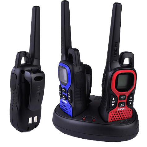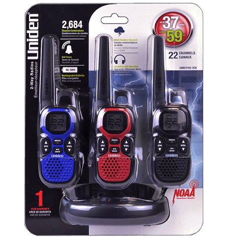 Specs====- Model: GMR3740-3CK- Channels: 15 GMRS, 7 FRS, 7 NOAA Weather- Sub Codes: 38 Sub-Audible Tones, 83 DCS Codes- GMRS/FRS Operating Frequency: 462.5500 - 467.7125 MHz- WX Operating Frequency: 162.4000 - 162.5500 MHz- Power: Rechargeable 3.6v 550mAh NiMH battery or 3x AAA Batteries (AAA batteries not included)- Range: 37 miles- Battery Life: up to 10 Hours with battery pack- 3.5mm headset jack- Backlit LCD display- Belt clip- Dual charging cradle- User manualCondition: NewWarranty:1 Year UnidenEstimated Delivery: 1/26 - 1/28Shipping: $5 or free with VMP What’s in the Box?====1x Red 2-way radio1x Blue 2-way radio1x Black 2-way radio1x Dual charging cradle1x AC adapterPictures ====Three colorsColors with chargerDetail of unitChargingRetail packagingPrice Comparison====$149.99 List, $43.97 at AmazonFind a relevant price comparison? Please share it in a comment in this thread